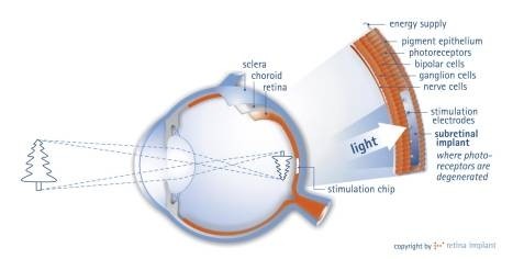 Retina Implant adlı bir Alman şirketi geliştirmiş olduğu retina-altı çözüm kapsamında geliştirdiği üç milimetrelik, 1500 piksel mikroçip sayesinde hastalara 12 derecelik görüş açısı sağlanabiliyor. Tavuk karası hastalığına yakalanmış 11 hasta üzerinde gerçekleştirilen denemelerde, şirket yedi hastadan olumlu sonuç aldı, hatta bu hastalardan bir tanesi benzer nesneleri (çatal, bıçak, kaşık) ayırt etmede ve basit okuma yapmada başarılı oldu. Sözünü ettiğimiz teknolojinin önünde gelişmesi için daha uzun bir yol var, bu arada söz konusu çözüm görme yetisini yavaş yavaş kaybeden kişiler üzerinde çalışıyor.