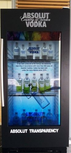 Samsung ve Absolut Votka’nın ortaklaşa tasarladığı buzdolabının kapağında şeffaf LCD ekran bulunuyor. Böylelikle buzdolabının üzerinde Absolut Votka’larının tanıtım videolarını oynatmak mümkün oluyor. Video oynatımı sırasında dolabın içindeki ürünler de görülüyor. Panelin 4500:1 kontrast oranı ve 1366 x 768 piksel çözünürlüğü bulunuyor. Her ne kadar arkasını gösterse de, renk gamının yüzde 70’ini de destekler nitelikte.
