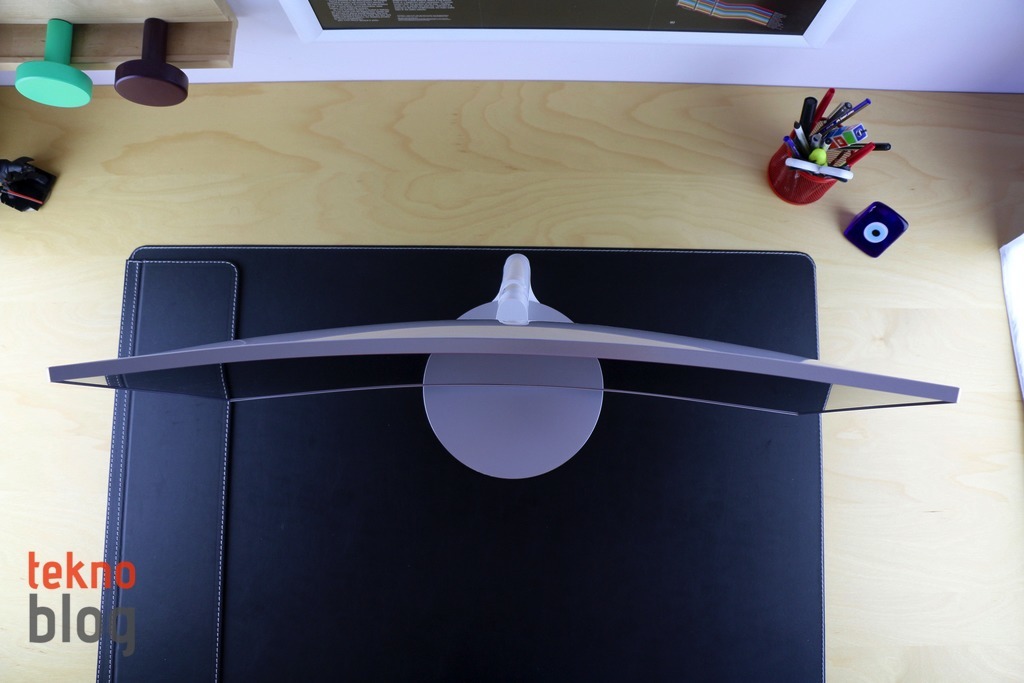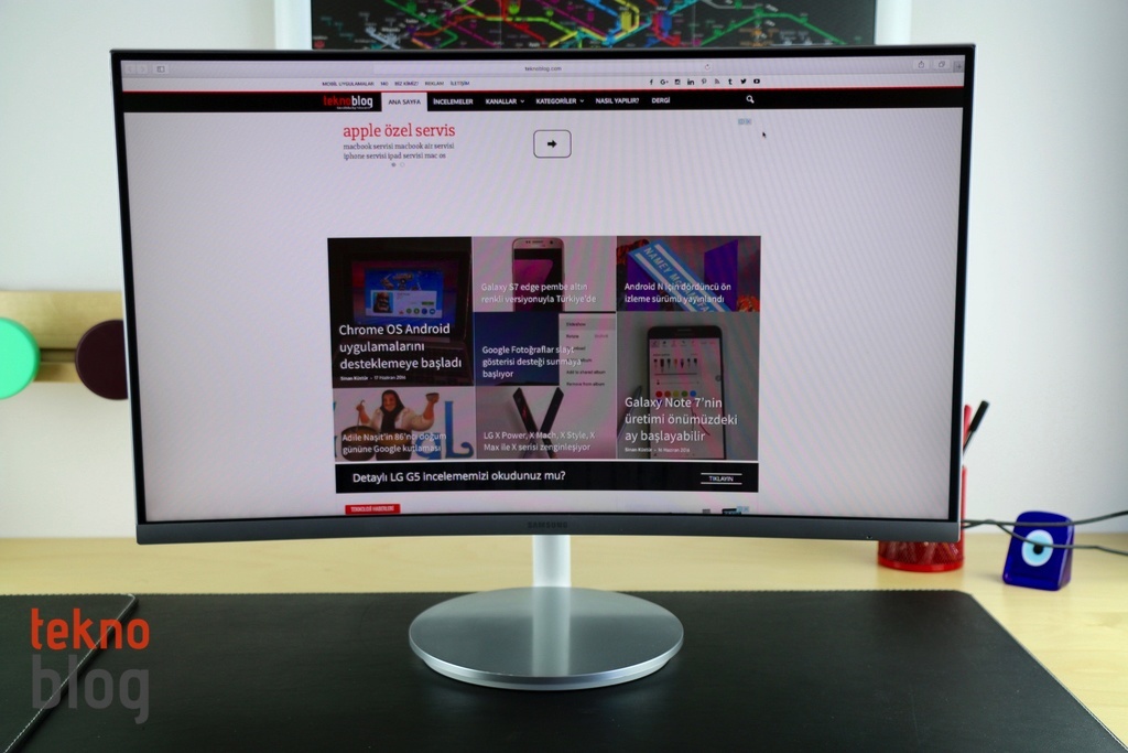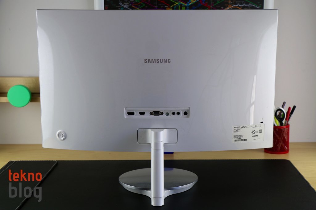27 inç’lik köşeden köşeye uzunluğa sahip kavisli LED panel barındıran bu Samsung monitörü ince ekran çerçevesi ve yuvarlak destek ayağı sayesinde masanızda fazla yer kaplamayacaktır. Yuvarlak destek ayağının geniş yüzeyi bu bölüme bir şeyler yerleştirmenize de izin veriyor. Örneğin bir Samsung Galaxy S7 veya S7 edge telefonunuz var. Eğer bir kablosuz şarj yastığı satın alırsanız, burası telefonunuzu şarj etmek için epey kullanışlı bir alan olacaktır. Monitörün ayaksız ağırlığı 3,5 kg., ayağıyla birlikte ise 4,4 kg. geliyor. Bu da monitörün odadan odaya rahatlıkla taşınabileceği anlamına geliyor.