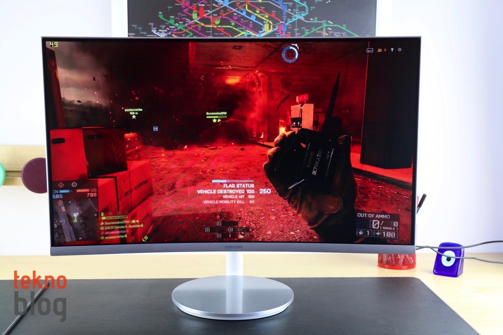 Samsung’un Active Crystal Color olarak adlandırılan teknolojisi bu kavisli monitörün canlı görüntüler ve renkler sunmasını sağlıyor. 16.7 milyon renk ile sRGB renk yelpazesinin yüzde 119’luk alanı destekleniyor, bu da özellikle oyunlarda ve filmlerde renklerin daha gerçekçi görünmesine, dolayısıyla görüntülerin gerçeğe daha yakın şekilde algılanıp daha sarmalayıcı hâle gelmesini sağlıyor. 3000:1 kontrast oranı da çok koyut ve parlak sahnelerde bile net görüş sağlıyor. Gerçekten de monitörün siyah renk derinliği epey fazla, bu da renk doğruluğu ve canlılığına olumlu katkıda bulunuyor.