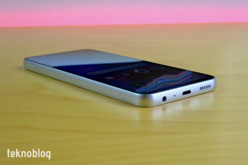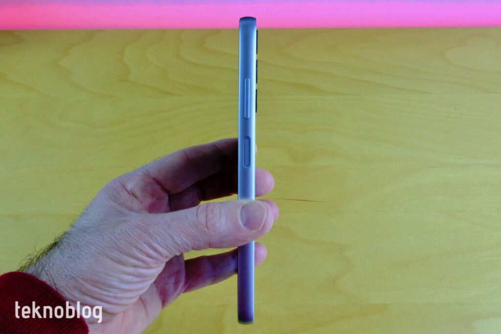 Sağ kenarda parmak izi okuyucusunun entegre edildiği güç düğmesi var. Bunun hemen üstünde ise ses tuşları var. Ses tuşlarının dışa doğru yaptığı çıkıntı iyi, el yordamıyla rahatça bulunuyor. Güç düğmesinin yüksekliği gövdeyi geçmese de, bu tuşun etrafında yeteri kadar verilmiş olan boşluk sayesinde bunu da el yordamıyla bulmak ve kullanmak mümkün oluyor. Alt kenarda USB-C portu, hoparlör, mikrofon ve 3.5mm kulaklık jakı var. Sol kenarda, üst tarafa epey yakın bir yerde ise çift nano SIM ve microSD kart yuvalarının yer aldığı tepsi var. Üst kenarda da ikinci mikrofon bulunuyor.