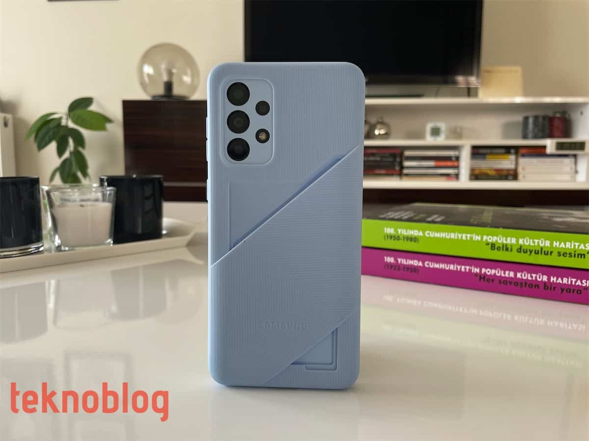 Galaxy A33 ile birlikte test merkezimize telefonla aynı renkte arkasına banka/kredi kartı ya da kimlik yerleştirilebilecek bir kılıf da ulaştı. Bu kılıf, telefonun kalınlığını doğal olarak artırıyor. Ancak cihazı kullanımda ekstra bir zorluk yaratmıyor ve güvenlik hissini de fazlasıyla güçlendiriyor.