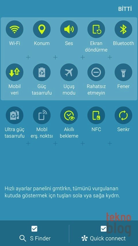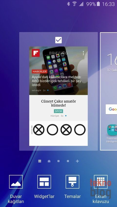 Ana ekran ise TouchWiz kullanıcı arayüzlerinin alıştığımız tarzını ve özelliklerini yansıtıyor. En solda, Flipboard tarafından desteklenen Briefing paneli yer alıyor. Bunun sayesinde gündemi yakından takip etmeniz mümkün oluyor. Bu işlevi istemediğiniz takdirde kapatma imkanına da sahipsiniz. Bildirim tepsisi içinde çeşitli hızlı ayarlar yer alıyor, bunun sayesinde Wi-Fi, Bluetooth gibi bağlantıları hızlı şekilde kontrol etmek, istediğiniz takdirde Rahatsız Etme modunu açmak kolaylıkla gerçekleştiriliyor.