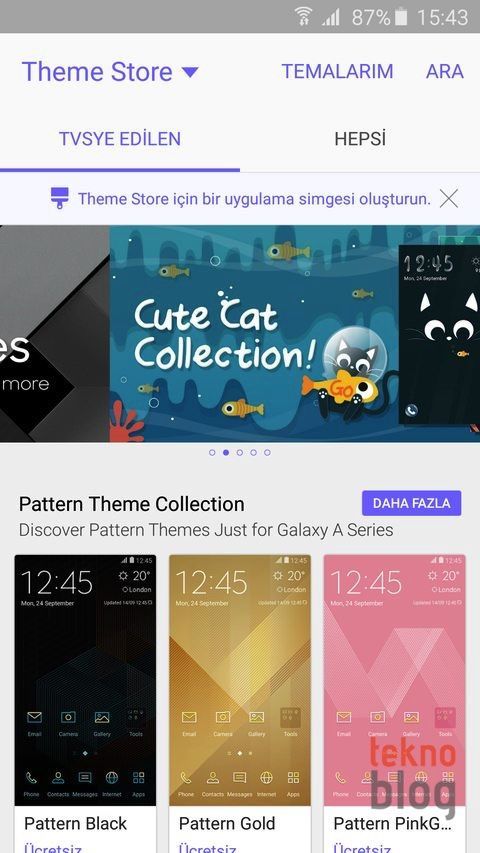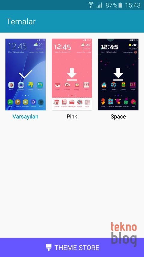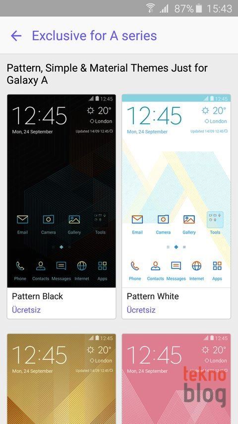 TouchWiz’in güzel özelliklerinden bir tanesi de tema desteği. Eğer telefonla yüklü gelen kullanıcı arayüzünden sıkıldıysanız, Temalar bölümüne girerek farklı bir tema seçebilir; uygulama ikonları, duvar kağıdı, temel uygulama görünümü gibi unsurları değiştirebilirsiniz. Tema Mağazası sayesinde daha fazla seçeneği telefona indirmek mümkün. Bunun yanı sıra Galaxy A serisi için de özel tema seçeneklerinin bulunduğunu belirtmeden geçmeyelim.