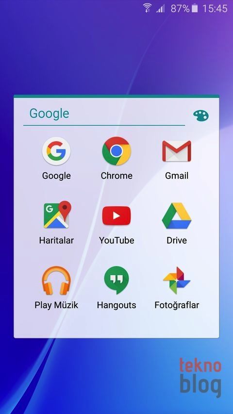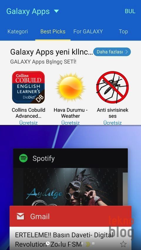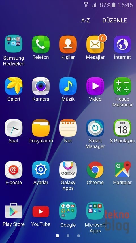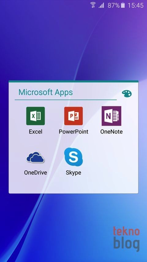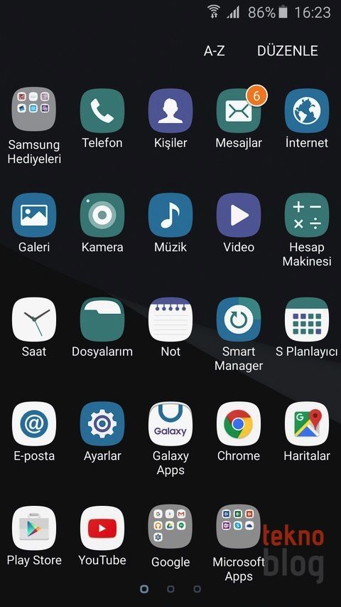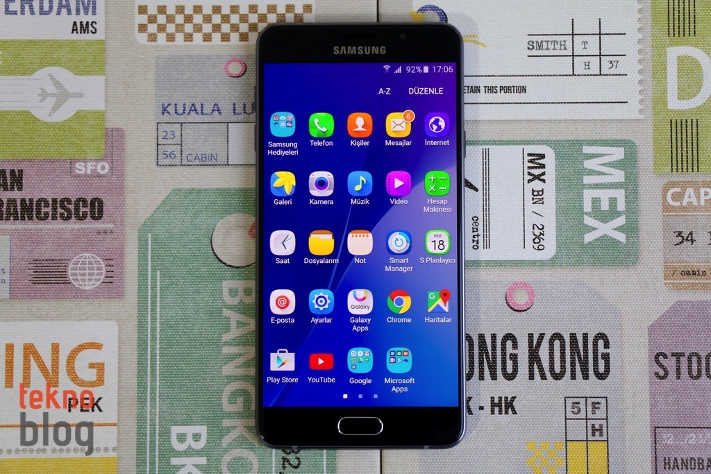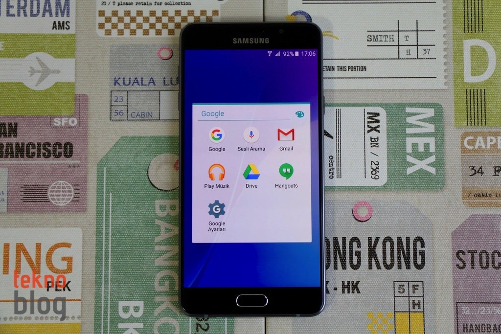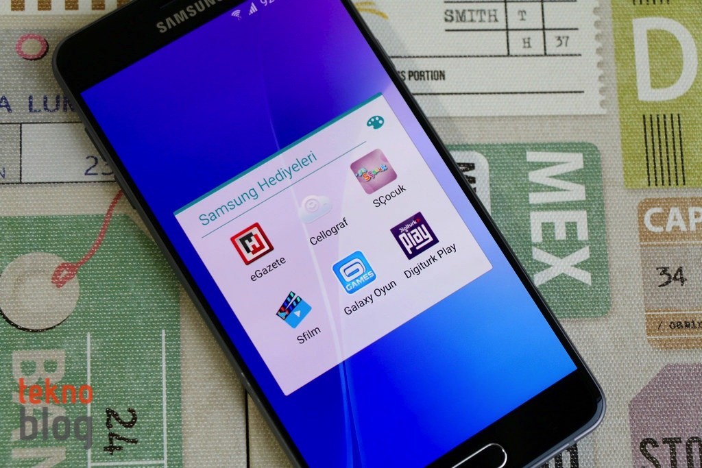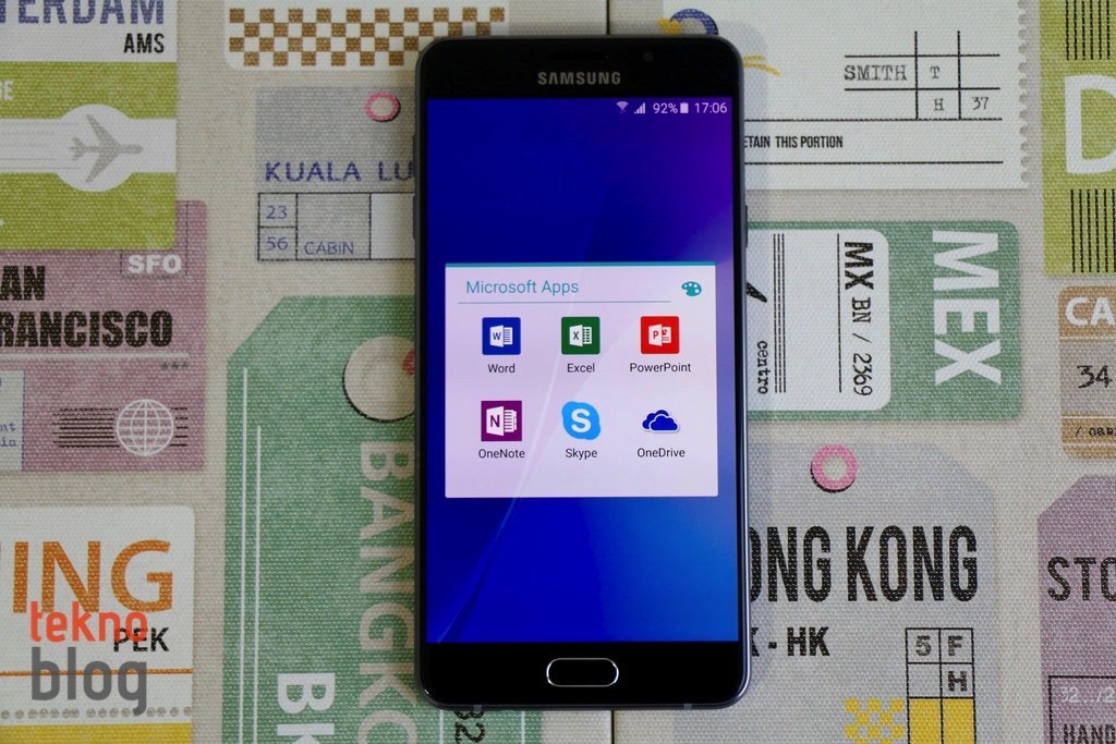 Yüklü gelen uygulamalar bakımından da durumun S6, Note 5 ve diğer Galaxy A (2016) telefonlarındakiyle hemen hemen aynı olduğunu görüyoruz. Gmail, Haritalar, YouTube gibi Google uygulamaları yüklü geliyor, bunlara Google klasörü altından erişmek mümkün oluyor. Bir de Microsoft Apps klasörü var ki, onun altında da Excel, PowerPoint, OneNote, OneDrive ve Skype uygulamaları bulunuyor. Samsung, Word’ü de yüklemiş, ancak nedense onu klasörden bağımsız olarak, tek başına ve daha fazla ön planda olacak şekilde sunmayı tercih etmiş. Bir de Samsung Türkiye’nin yüklediği ve çeşitli hediyelerle sunduğu Hürriyet e-Gazete, Cellograf, SÇocuk, Sfilm, Galaxy Oyun ve Digiturk Play gibi uygulamalar var.