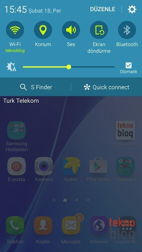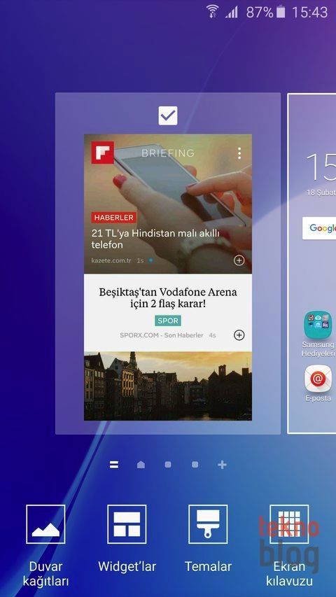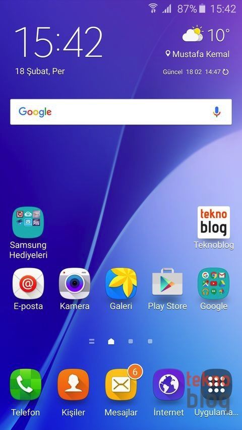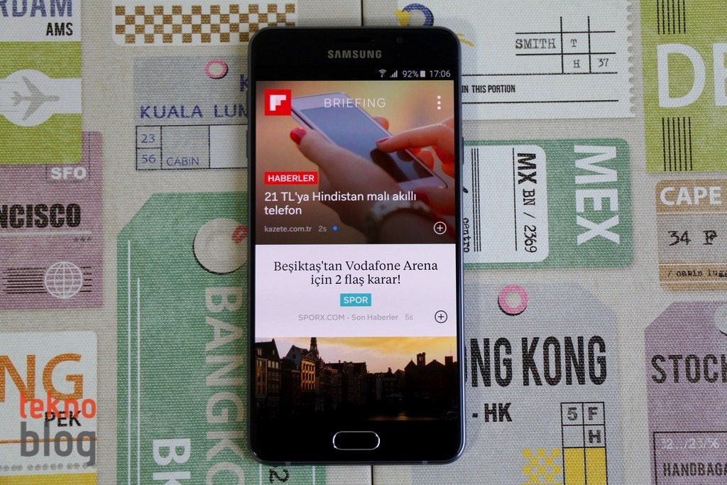 TouchWiz’in daha önce S6 ve Note 5 gibi telefonlarda gördüğümüz versiyonunu Galaxy A7’de de görüyoruz. Daha önce bu telefonları kullandığımız için A7’nin TouchWiz’i bize pek yabancı gelmiyor. Köşeleri hafifçe yuvarlatılmış karesel uygulama ikonları, mavi tonlarının epey ağırlıkta olduğu varsayılan tema, sayfalı yapıdaki uygulama menüsü başlıca özellikler arasında. Bu arada Briefing adı verilen, Flipboard destekli haber paneli de ana ekranda, en soldaki panelde yer alıyor. Eğer isterseniz bu paneli devre dışı bırakmanız mümkün.