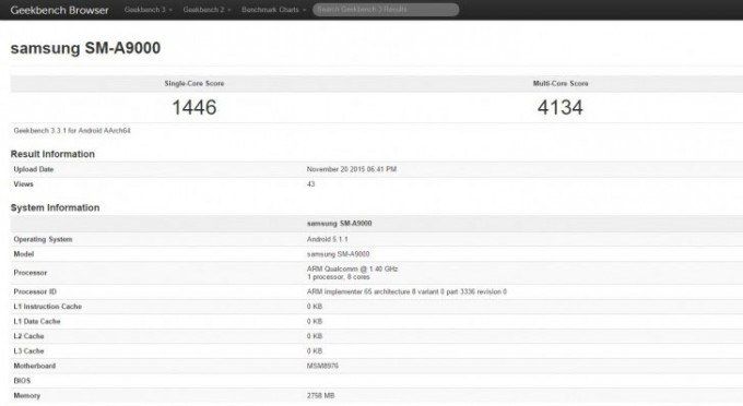 Benchmark testi Samsung Galaxy A9 için 2758 MB RAM ve Android 5.1.1 işletim sistemini işaret ediyor. A serisinin en yeni üyesi olacak telefonun kısa bir süre içinde duyurulması bekleniyor.
