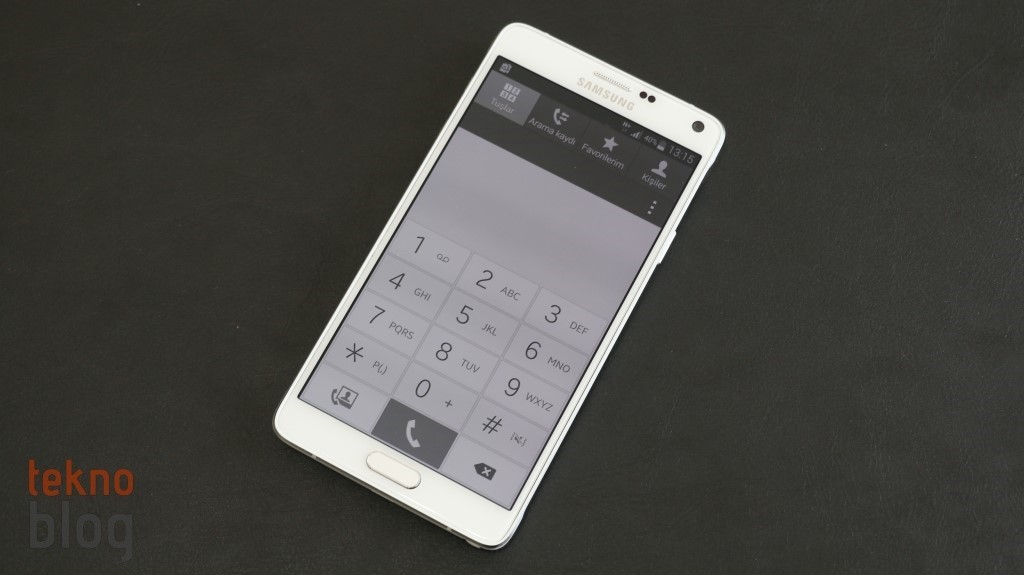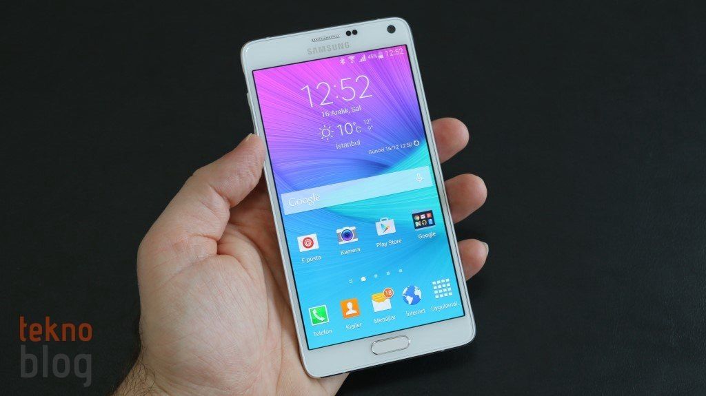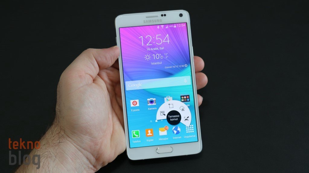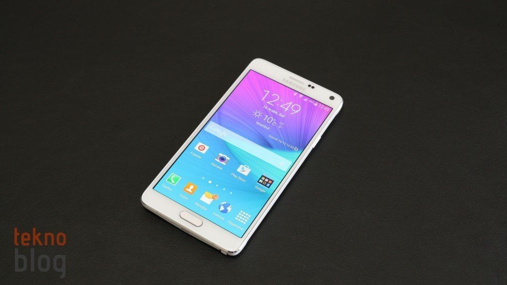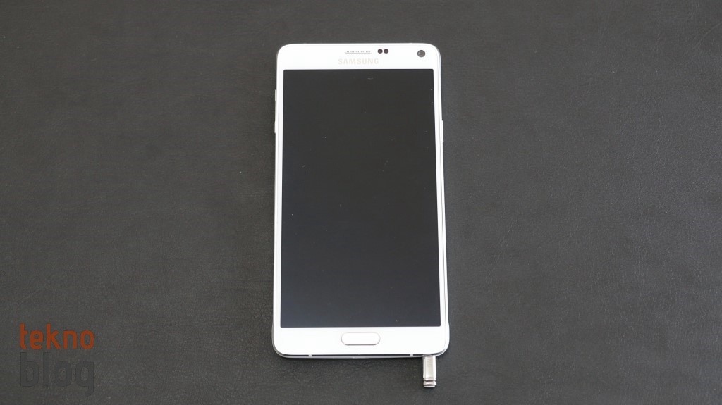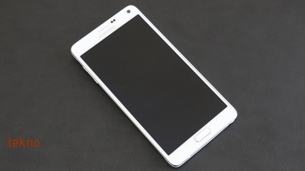 Ön yüz Corning Gorilla ekran camıyla boydan boya kaplanmış. Galaxy Note 4 için herhangi bir ekran filmi satın almanıza gerek yok, çünkü bu ekran camı epey dayanıklı, yaklaşık üç haftalık kullanımızdan sonra bile ekranı parlak ışığa tutup baktığımızda üstünde belirgin bir çizik olmadığını görüyoruz. Bir film yapıştırıp da Quad HD ekranın güzelliğini bozmayın. 5.7 inç ekranın çerçevesi kenarlarda epey dar tutulmuş, böylelikle telefonun rahat tutulmasını sağlayacak bir en değeri yakalanmış. Alt ve üstteki bölümlerin de çok geniş olmadığını görüyoruz.