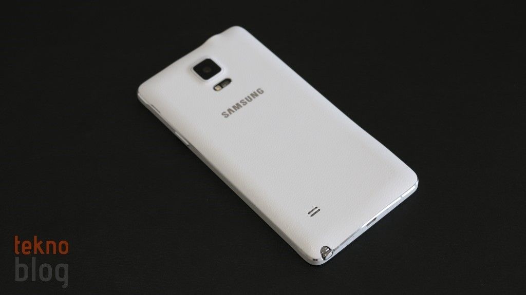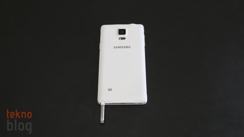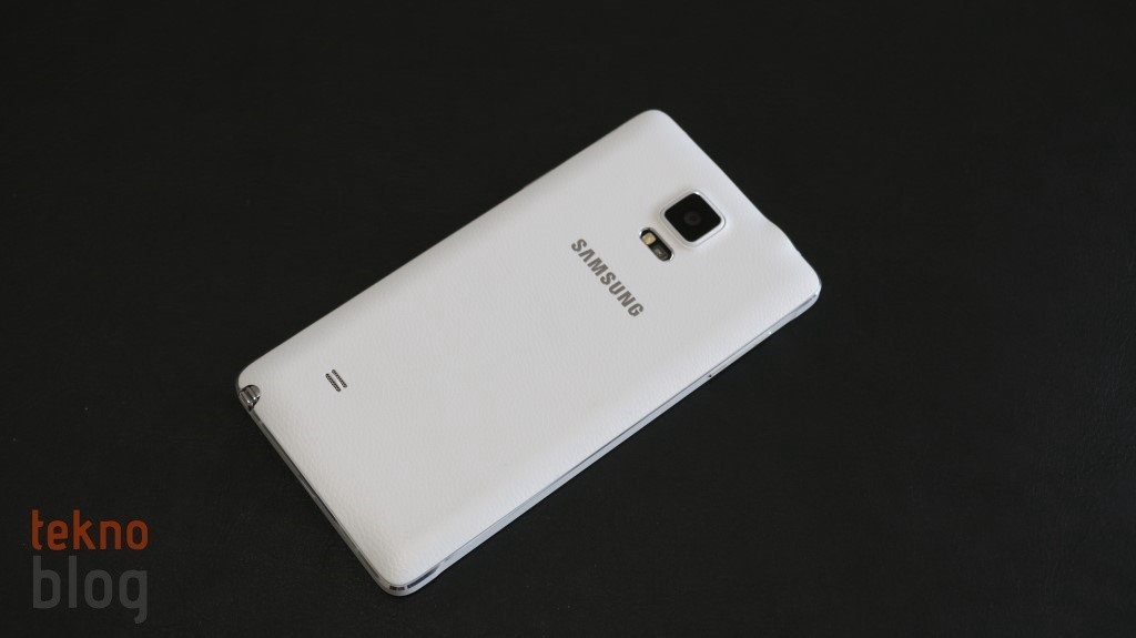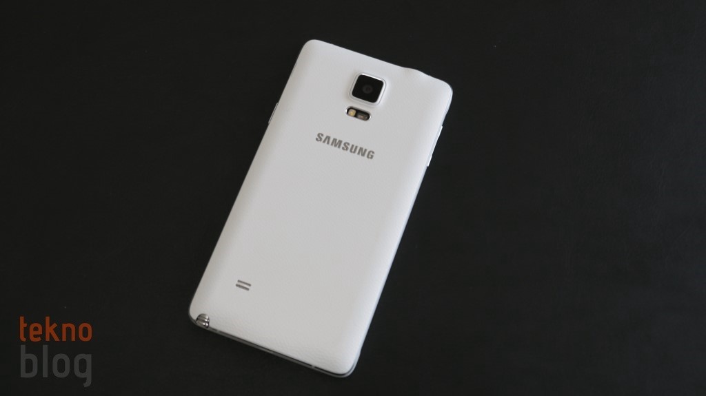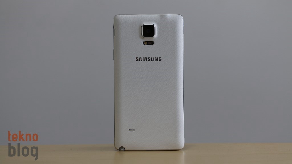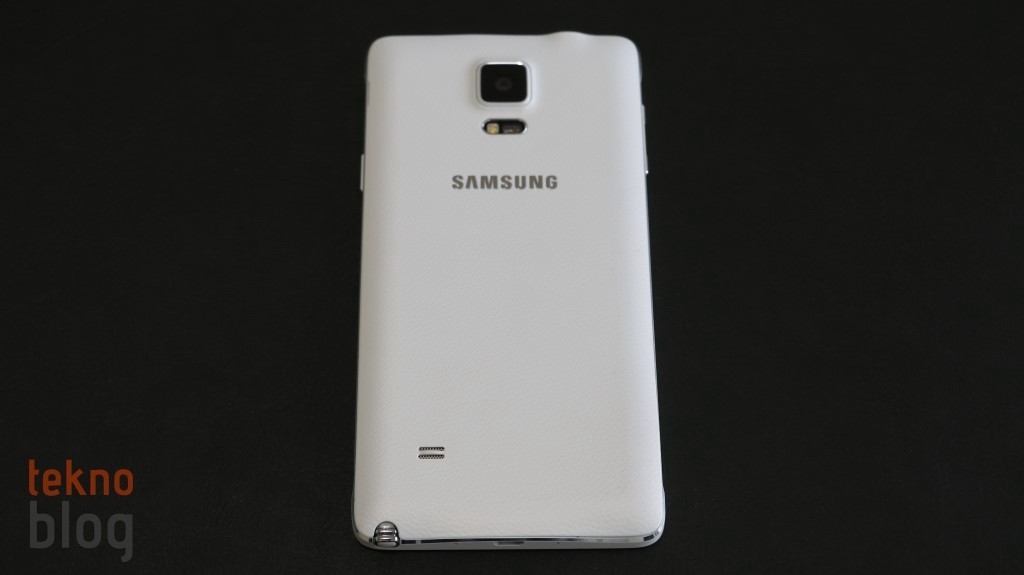 Galaxy Note 4’ün arkası suni deri kaplı plastik bir kapakla örtülüyor. Böylelikle Note 3’teki tercih devam ettiriliyor, ancak Note 4’te kullanılan malzeme biraz daha kaliteli olduğu hissini veriyor. 16 megapiksel kamera üste doğru yerleştirilmiş ve ortalanmış. Bunun altında LED flaşla birlikte, ilk kez Galaxy S5’te gördüğümüz kalp hızı ölçer de yer alıyor. Hemen aşağıda Samsung logosu, alt kenara doğru inildiğinde biraz sola doğru kaçacak şekilde hoparlör ızgarasını görüyoruz.