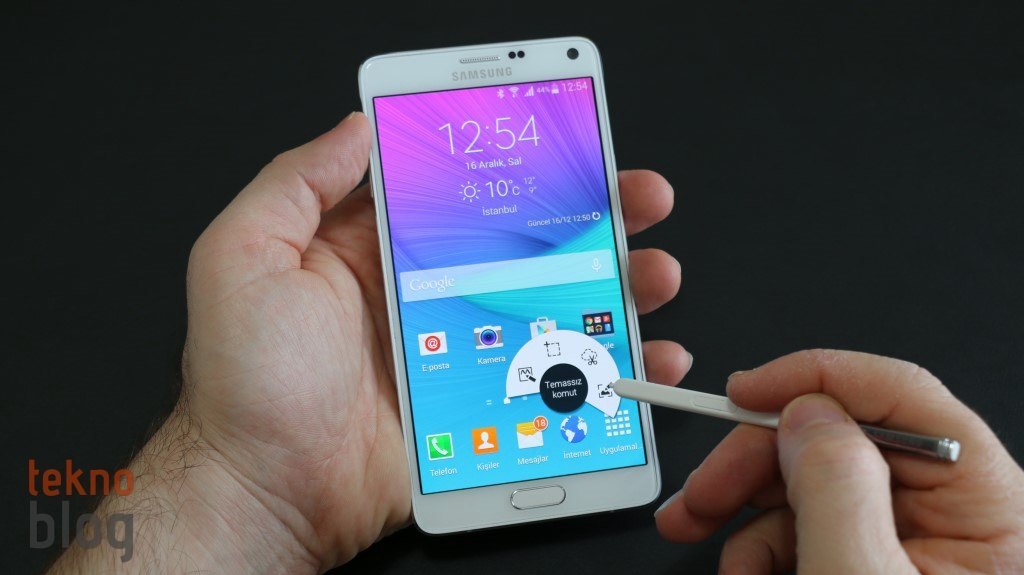 Samsung Galaxy Note 4’te yer alan S Pen kapasitif kalem, Note 3’teki versiyona göre fazla değişiklik göstermiyor, ancak artırılan basınç hassasiyeti sayesinde gerçek bir kalem-defter deneyimine daha yakın çizim ve yazım imkanı sağlanıyor. S Pen’i yuvasından çıkardığınız anda Temassız Komut olarak adlandırılan bileşen aktif oluyor. Ayrıca eğer S Pen daha önce yuvasından çıkarıldıysa, kalem ekrana doğrultulmuşken üstünde bulunan tuşa art arda iki kez basarak da Temassız Komut aracını görüntüleyebilirsiniz. Temassız Komut açıkken her bir öğe üstünde S Pen’i havada asılı tutarak söz konusu işlevin ne olduğunu görebilirsiniz.
