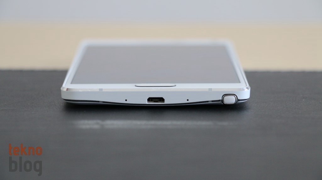Samsung’un Galaxy Android telefonlarındaki standart tuş dizilimlerini Galaxy Note 4’te görüyoruz. Sol kenarda ses tuşları, sağ kenarda da güç butonu bulunuyor. Bunlar tek elle tutuşta parmakların herhangi bir zahmet göstermeksizin erişebilecekleri noktalarda. Üst kenarda 3.5 mm. kulaklık jakı, ikinci mikrofon ve kızıl ötesi portu yer alırken alt kenarda iki mikrofon deliği ve microUSB portu dikkat çekiyor. Samsung, Note 3’te USB 3.0 destekli microUSB portu kullanmıştı, ancak bu nesilde alıştığımız port tercihine geri dönmüş. Ayrıca alt kenarda S Pen’in saklandığı yuvanın bulunduğunu da belirtelim.
