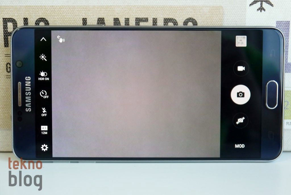 Ana ekran tuşuna art arda iki kez basarak Kamera uygulamasını hızlı şekilde açabilir ve hemen çekime başlayabilirsiniz. Kamera uygulaması epey kullanışlı, ekranın bir kenarında fotoğraf ve video çekim tuşlarını görüyoruz. Ayrıca ön ve arka kameralar arasında geçiş sağlayan düğme de bu kenarda bulunuyor. Mod tuşu Galaxy Note 5’in kamerasının Otomatik, Pro, Seçmeli odak, Panoramik gibi farklı çekim modlarına erişmenizi sağlıyor. Mod tuşunu kullanmak yerine parmağınızı telefonun kenarından sola, ortaya doğru sürükleyerek de mod arayüzünü açabilirsiniz. Ekranın diğer tarafında çözünürlük, zamanlayıcı, flaş, HDR gibi hızlı ayarlar mevcut. Kısacası Kamera uygulaması sade ve kolaylıkla kullanılabilir bir kullanıcı arayüzüne sahip.