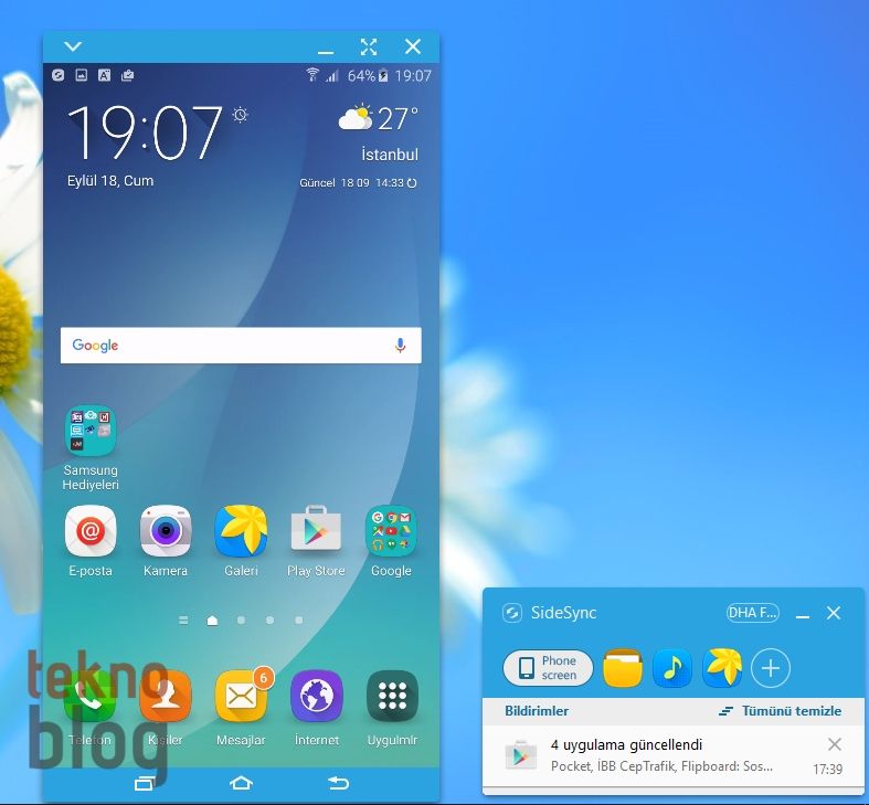 SideSync uygulaması için de bir paragraf açmak gerekiyor. SideSync sayesinde Note 5’i başka bir cihaza bağlayıp ekranı oraya yansıtabilirsiniz. Sonrasında görüşme yapma, uygulamaları kullanma gibi, Note 5’te yaptığınız bütün işleri Note 5’i bağladığınız cihaz üzerinden gerçekleştirebilirsiniz.