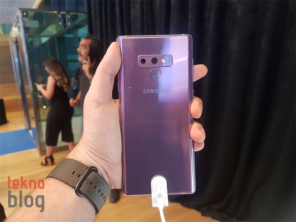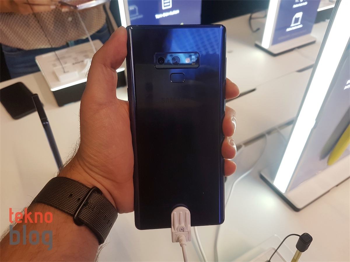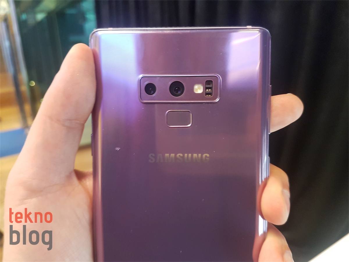 Samsung Galaxy Note 9, çift lensli bir arka kamera modülü bulunuyor. Bu modül arka panelin üst orta kısmında yatay vaziyette yer alıyor. Dikdörtgen parmak izi tarayıcısı ise kamera modülünün arkasına yerleştirilmiş. Bu yerleşim, Samsung’un tarayıcının tasarımı konusunda kullanıcılarından gelen şikayetlere kulak verdiğini gösteriyor.