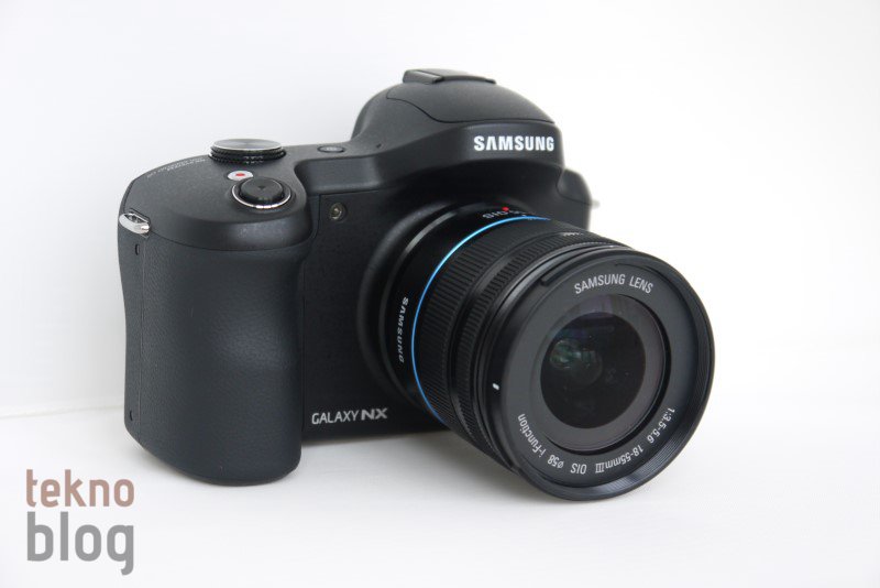 Galaxy NX değiştirilebilir lens sistemine sahip bir makine olarak dikkat çekiyor. Samsung’un sunduğu ve aralarında üç boyutlu lensin de bulunduğu çeşitli lensleri takarak farklı amaçlar için bu makineyi kullanabilirsiniz. Lens yuvasının hemen yanında yer alan düğmeyi kullanarak lensi kolaylıkla çıkarabilirsiniz. Önden baktığınızda lensin sol üst köşesinde odaklama yardımcı ışığı bulunuyor. Bunun paralelinde, aşağıda kalacak şekilde de Galaxy NX yazısını görüyoruz.