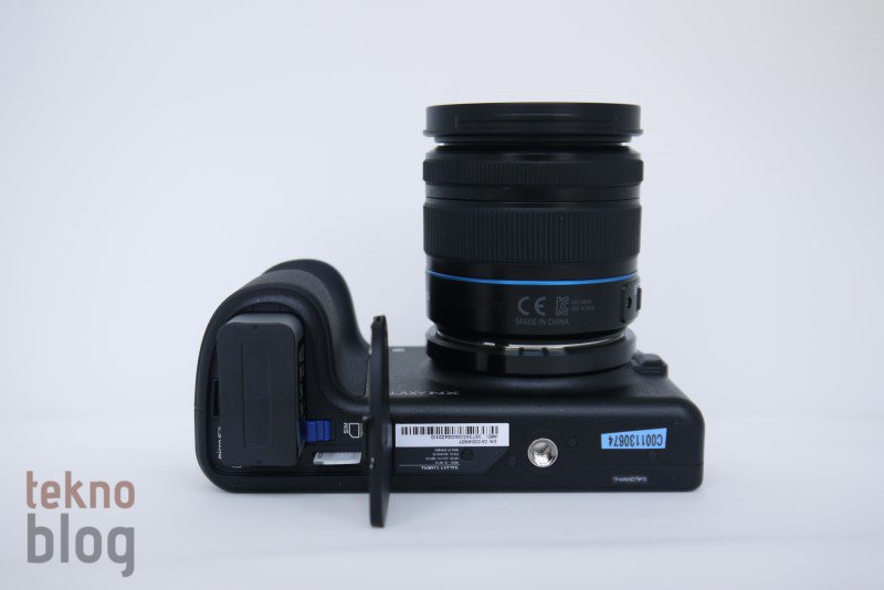 Makinenin sol kenarında 3.5 mm. kulaklık jakı ve bir kapak arkasına gizlenmiş microUSB ve microHDMI portları yer alıyor. Bu kapağın hemen yanında da hoparlörü görüyoruz. Hoparlörün ses çıkış şiddeti makul seviyede, çekilen görüntüleri veya herhangi bir Android uygulaması içinden açılmış videoyu izlerken yeterli oluyor. Karşı kenarda, kabzanın olduğu bölümde herhangi bir şey görmüyoruz. Alt bölümde tripod yuvası yer alırken, kabzanın bulunduğu kenarda bir kapak arkasında gizlenmiş microSD ve microSIM kart yuvaları bulunuyor. Ayrıca Galaxy NX’in 4360 mAh kapasiteli bataryası da bu bölüme yerleştirilmiş.