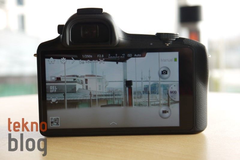 Samsung Galaxy NX’in siyah renkli gövdesi bir hayli çekici ve kullanıcılarına bir DSLR kullanıyormuş hissini fazlasıyla veriyor. Deri görünümünde kaplamaya sahip olan kabzası sayesinde makine rahatlıkla tutuluyor ve kullanılıyor. Profesyonel kullanıcılar genellikle kolaylıkla ayar yapmalarını sağlayan fiziksel kontrolleri severler, Galaxy NX bu açıdan biraz sınırlı hizmet sunuyor. Üst bölümde yer alan mod kadranı farklı çekim modları arasında hızlı geçiş yapmayı sağlıyor. Bunun dışında pozlama telafisi, beyaz dengesi gibi ayarlar için arkayı tamamen kaplayan dokunmatik ekranı kullanmak gerekiyor. Belki fiziksel kontrolleri kullanmak kadar pratik sayılmaz, ancak Samsung Galaxy NX’in kamera arayüzü pratik düzeni sayesinde sözünü ettiğimiz ayarları elle yapmayı kolaylaştırıyor. Ayrıca akıllı telefonlardan alıştığımız şekilde ekran üstüne dokunarak odak noktasını ayarlama imkanını da sunuyor.