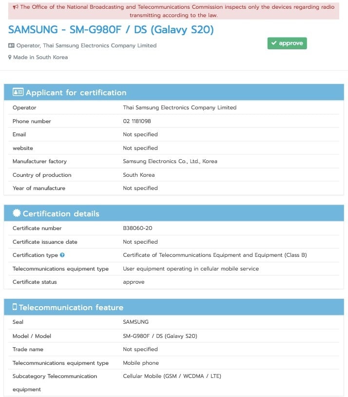 Resmi belgede, Galaxy S20’nin adının “Galavy S20” olarak yazılması dikkat çekiyor. Ancak bunun basit bir yazım hatasından fazlası olmadığı rahatlıkla anlaşılıyor. Samsung’un Tayland ofisi tarafından yapılan başvuruda cihazların üretim yeri olarak Güney Kore gösteriliyor.