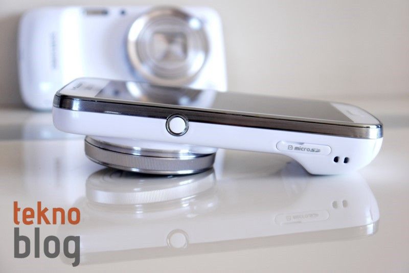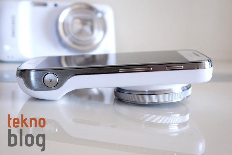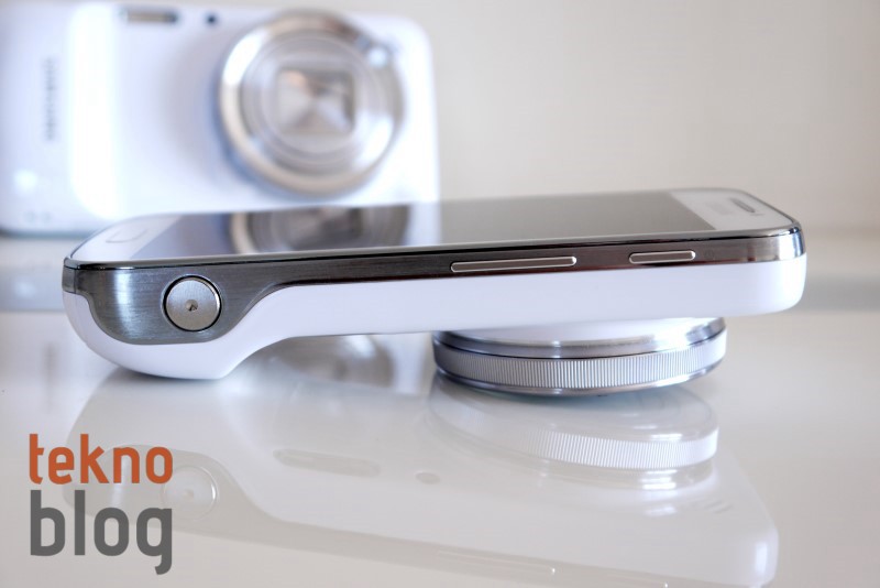 Samsung Galaxy S4 Zoom’un sağ kenarında açma kapatma ve ses kademe tuşları diğer Samsung telefonlarında gördüğümüz gibi üste doğru, baş veya işaret parmaklarının rahat erişeceği yere konumlandırılmış. Telefonun profili, kabza nedeniyle aşağı doğru şişmanlaşıyor. Bu bölüme deklanşör tuşunun yerleştirildiğini görüyoruz. Telefonun sol kenarı biraz daha dijital fotoğraf makinelerinin alt kenarını andırıyor. Monopod veya tripodlara takılmayı sağlayan yuva, kullanılmadığı zamanlarda göz tırmalamasın diye beyaz bir tıpayla kapatılıyor. Biraz daha ilerlediğimizde microSD kart yuvasını ve bilek kayışının bağlanmasını sağlayan deliği görüyoruz.