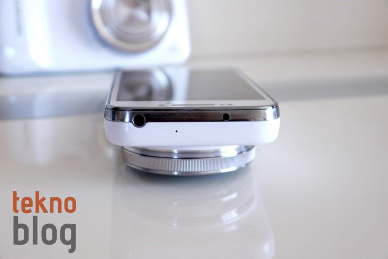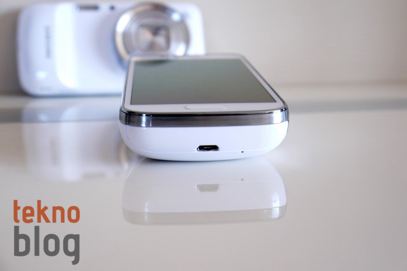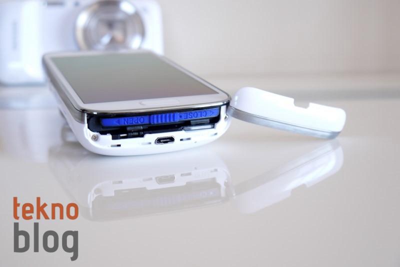 Galaxy S4 Zoom’a akıllı telefon tarafından baktığımızda üst kenarda 3.5 mm. kulaklık jakı, kızılötesi portu ve çekim sırasında ses kaydını güçlendiren mikrofonu görüyoruz. Alt kenarda ise ikinci mikrofon ve microUSB portu görünür kısımda dikkat çekiyor. Aslında bu bölüm bir kapaktan ibaret ve yanında bulunan çentik yardımıyla onu açtığımızda karşımıza microSIM kart yuvası ve bir kilit mekanizması arkasına gizlenmiş batarya yer alıyor.