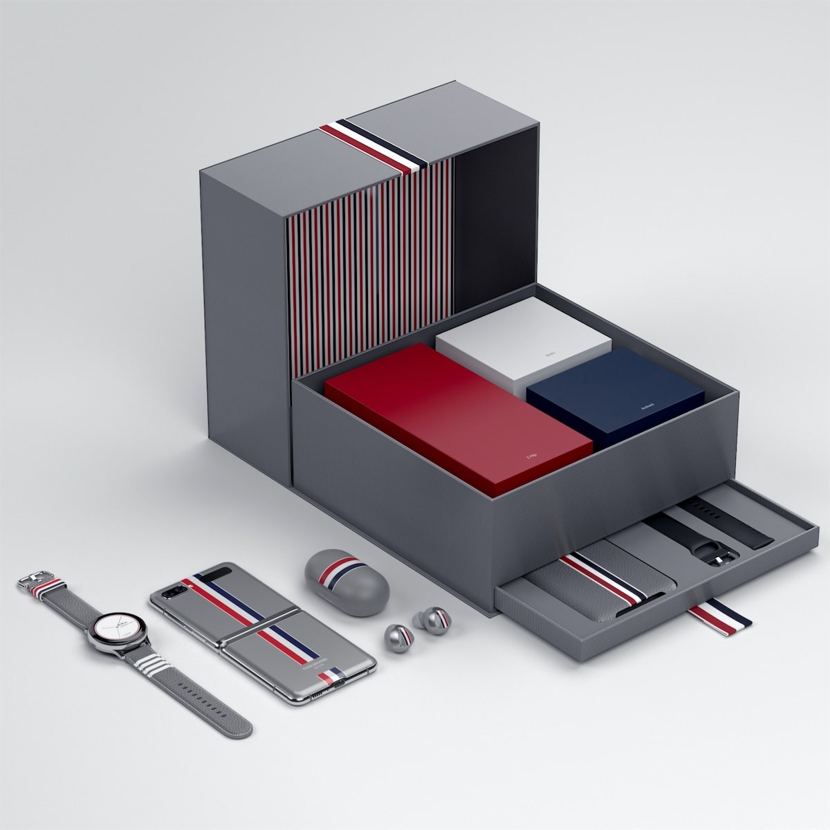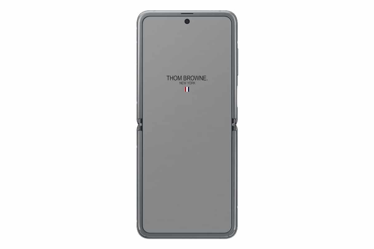 Özel tasarım Galaxy Z Flip’te gri renkli telefonun üzerinde Thom Browne’un imzası olarak tanımlanabilecek kırmızı, beyaz ve lacivert renkli şerit yatay biçimde işlenmiş. Samsung, Galaxy Z Flip’in yanı sıra Galaxy Buds Plus ve Galaxy Watch Active için de Thom Browne ile birlikte özel versiyonlar hazırladı.