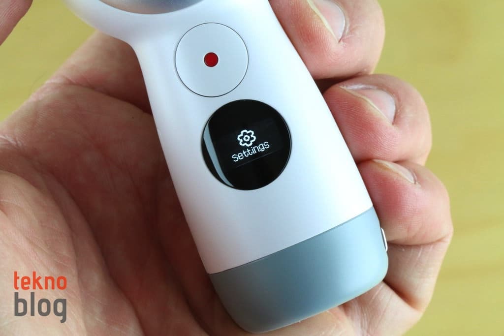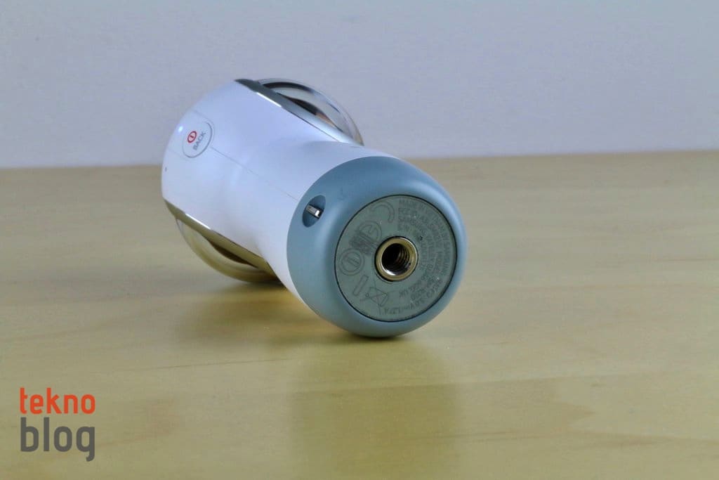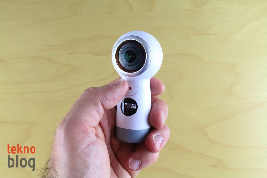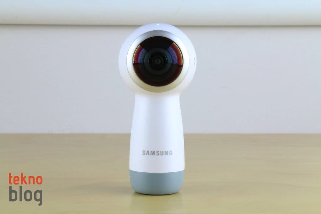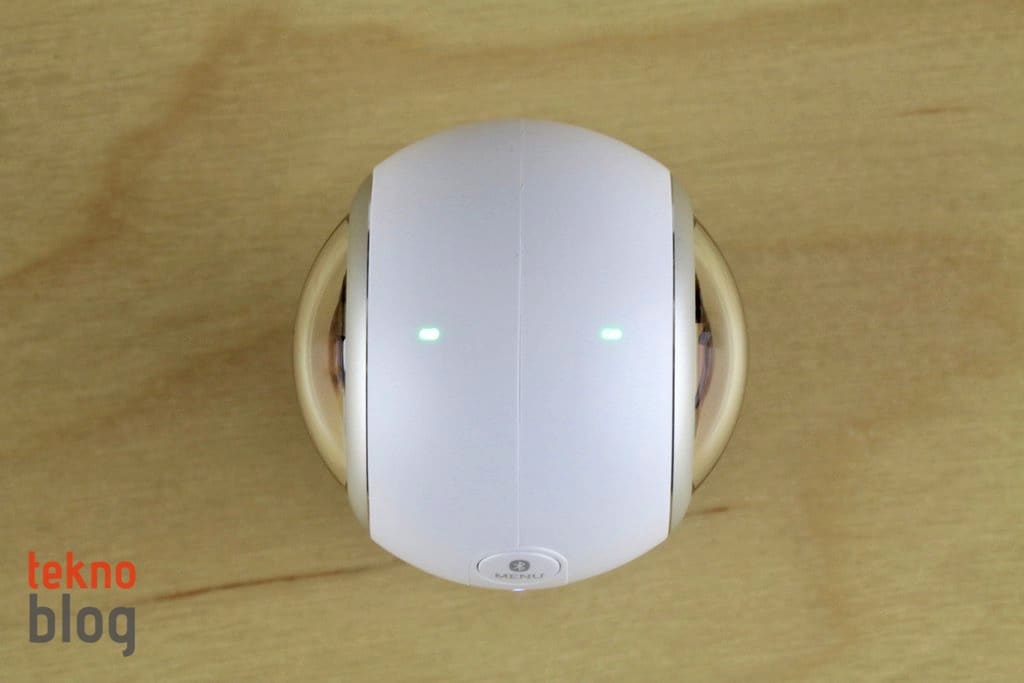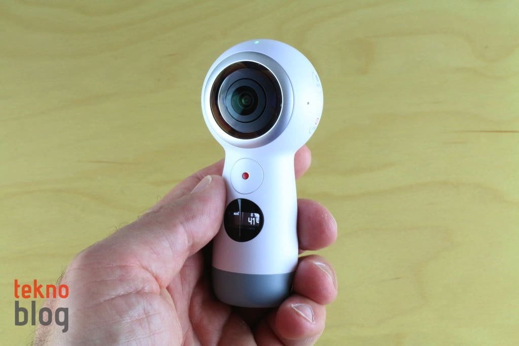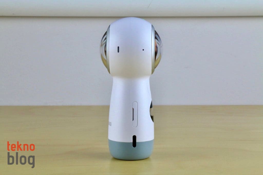 2017 model Gear 360’ın selefine göre en büyük farklılığı değişen boyutları oluyor. Yeni nesil modelde kameraların yer aldığı küresel bölüm daha küçük hacim kaplıyor. Ayrıca geçen yılın Gear 360 kamerasında alt kısımda yer alan ve açıldığında kameranın bir tripod üzerinde duruyormuş gibi kararlı şekilde dengede kalmasını sağlayan açılır ayaklı yapının yerini, kamera bölümünün uzantısı şeklinde aşağı doğru uzayan bölüm alıyor. Bu bölümde LED kontrol ekranı, çekim tuşu yer alıyor. Ayrıca microSD kart yuvası ve USB-C portu da bu bölümde bulunuyor. Kameranın tepesine yerleştirilmiş iki adet lamba ile hangi kameranın aktif olduğu gösteriliyor. Menü ve güç butonlarını da kenarda görüyoruz. Ayrıca mikrofon da kenarda yer alıyor.