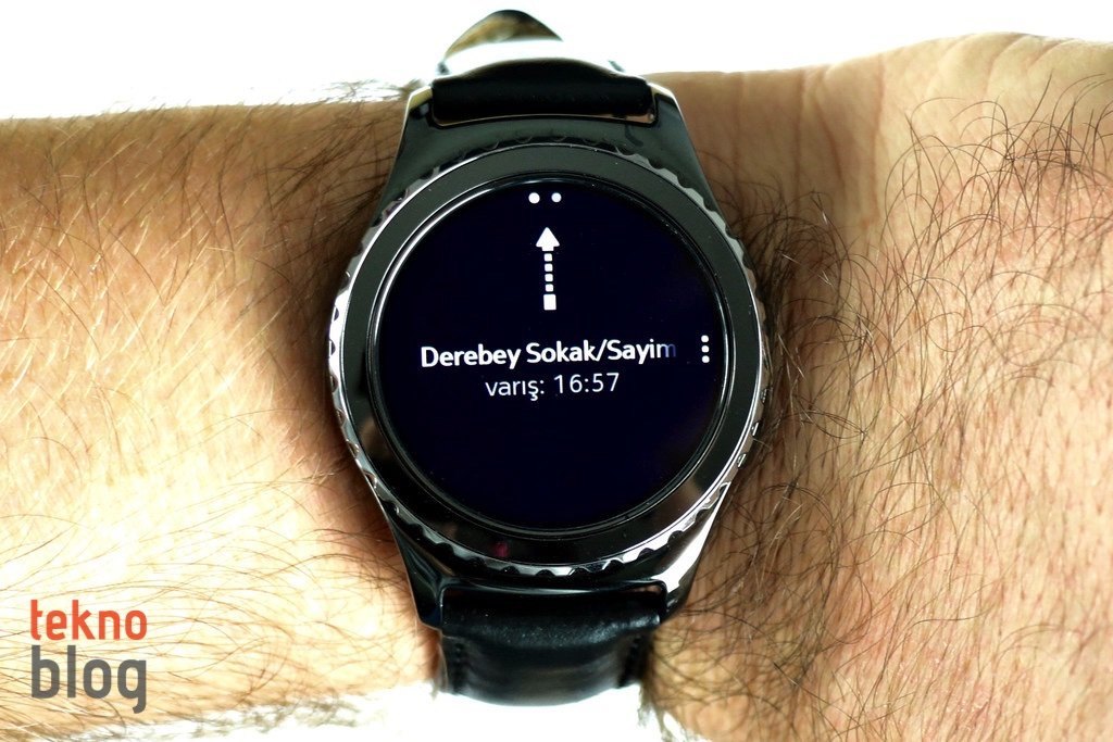 Gear S2’de navigasyon işleri Here Maps uygulamasına emanet. Here Maps’in çalışması için Gear S2’nin akıllı telefona Bluetooth üzerinden eşleştirilmiş ve akıllı telefonda da Here Maps uygulamasının yüklü olmas gerekiyor. Gideceğiniz yeri doğrudan S2 üzerinden girip navigasyonu başlatabilirsiniz. Sesli navigasyonu, yüklediğiniz takdirde Here Maps üzerinden Türkçe olarak da alabilirsiniz.