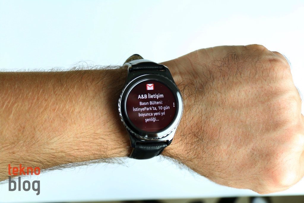 Gerçekten de S2’nin kullanıcı arayüzünde gezinirken eliniz ister istemez bezel halkaya gidiyor, dokunmatik ekran nadiren, genellikle uygulama seçiminde veya metin girişinde kullanılıyor. Saat yüzü açıkken bezel halkayı sola çevirdiğinizde gelen en son bildirimlere erişiyorsunuz. Akıllı telefonunuza gelen bildirimler doğrudan S2’nin bildirim alanına düşüyor, akıllı telefonunuzdan hangi uygulamaların bildirimlerinin saate iletileceğini seçebiliyorsunuz. Bildirimler sadece gösterilmekle kalmıyor, aynı zamanda bunlar üzerinde aksiyon almak mümkün oluyor.