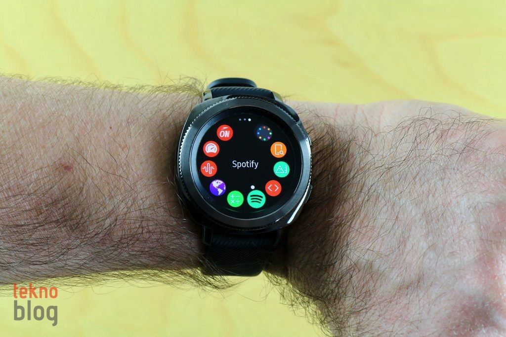 Uygulamalar içinde en fazla memnun edeni Spotify oluyor. Galaxy Apps’ten ücretsiz olarak indirebileceğiniz Spotify uygulamasını, Spotify Premium aboneliğiniz varsa, akıllı telefon veya diğer cihazlarda olduğu gibi kullanabilirsiniz. Listelerinizi veya parçaları Gear Sport’un dahili hafızasına indirebilir, dışarıda spor yaparken dinleyebilirsiniz. Gear Sport’ta dahili hoparlör bulunmadığı için, akıllı saate bir Bluetooth kulaklık bağlamanız gerekiyor. Ancak dikkatli olun, bir kulaklık bağlı olmasa bile, Spotify uygulaması parçaları çalmayı sürdürüyor. Bu nedenle saatinizin pili gereksiz yere tükenebilir.