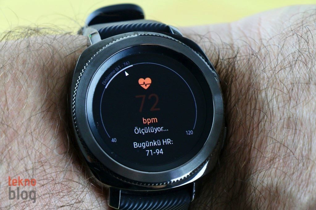 Gear Sport’ta da dahili GPS modülü bulunuyor. Böylelikle dışarıda gerçekleştirdiğiniz koşu veya yürüyüş gibi egzersizler sırasında akıllı telefonunuzu yanınıza almanıza gerek kalmıyor. Gidilen mesafe, rota, kalori ve bunun gibi bilgiler GPS modülü sayesinde rahatlıkla hesaplanıyor. Bunun dışında dahili kalp hızı ölçer de mevcut. Kalp hızı ölçümü belirli aralıklarla gerçekleştiriliyor. Kalp hızı ölçümlerini saat şekli açıkken bezel halkayı sağa çevirdiğinizde karşınıza çıkacak görsel bileşen üzerinden görebilir, yeni bir ölçüm gerçekleştirebilirsiniz. Görsel bileşende gün içindeki kalp hızı aralığı gösteriliyor. İlginçtir ki, egzersiz yaptığımız günlerde, kalp hızı çok daha yüksek seviyeye çıksa da, bu bileşendeki en yüksek kalp hızı ölçümü daha düşük seviyede kalıyor. Yine de, kalp hızı ölçerin sapmasının makul sınırlar içinde olduğunu söyleyebiliriz. Ölçüm sonuçları doğrudan bir kriter olarak alınmayabilir, ancak fikir vermesi açısından yararlı oluyor.