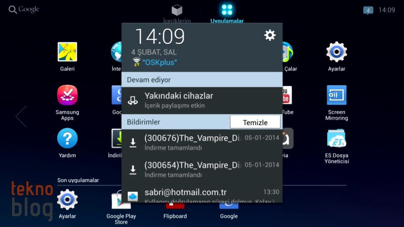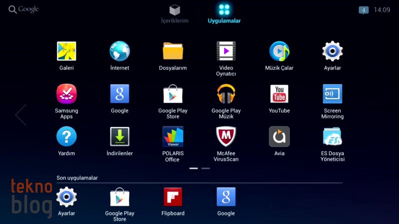 Uygulamalarım bölümü altında da Galeri, İnternet Tarayıcısı, Dosyalarım, Video Oyantıcı, Müzik Çalar, Samsung Apps, Google, Google Play Müzik, YouTube, Screen Mirroring, Polaris Office ve McAfee VirusScan gibi uygulamaların yüklü olarak geldiğini görüyoruz. Bunun dışında Samsung Apps veya Google Play üzerinden yeni uygulamalar yüklemek mümkün. Ne var ki, Google Play Store üzerinden tüm uygulamalara erişmek mümkün olmuyor. Facebook, Twitter gibi sosyal medya uygulamalarını, MXPlayer gibi video uygulamalarını bu cihaza indirmek mümkün olmuyor. Yine de, HomeSync’e yükleyebileceğiniz popüler Android uygulamaları bulunuyor. Avia Player, Evernote, Flipboard, Plex, VPlayer gibi uygulamaları bunlar arasında sayabiliriz.