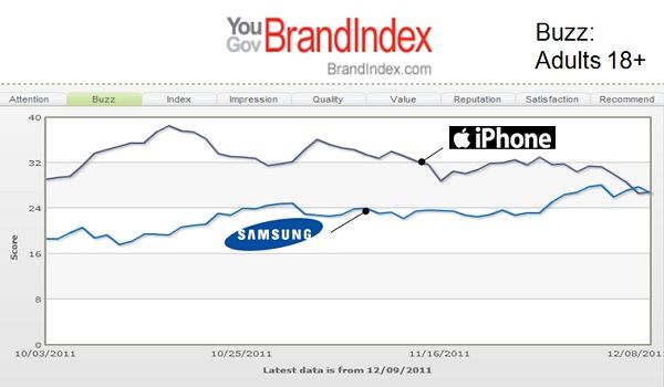 ABD’ye odaklandığı görülen araştırmada bu sonuçların çıkmasında Samsung’un doğrudan Apple’ı hedef alan reklamlarının rolü olabilir. Samsung ABD’de piyasaya sürdüğü Samsung Galaxy S II akıllı telefonlarının tanıtımı için Apple’ın iPhone’u için sırada bekleyen kalabalıkları hedef alan bire reklam hazırlamıştı. YouGov’un araştırması ilk reklam yayınlandıktan itibaren iPhone’a yönelik müşteri algısında düşüş başlamış.