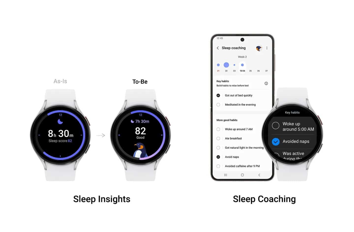 Samsung zaman zaman uyku izleme özellikleri konusunda rakiplerinin arkasında kalmakla suçlanıyor. Güney Koreli şirket bu özelliklerini son olarak bir yıldan biraz uzun süre önce güncellemişti. Samsung One UI Watch 5 ile birlikte kullanıcılar uyku skorlarını daha net şekilde ve doğrudan saatleri üzerinden görebilecek. Buna ek olarak, kronotip tabanlı Uyku Koçluğu özelliğini aktif hâle getirerek uyku verilerine doğrudan saat üzerinden erişmek de mümkün olacak.