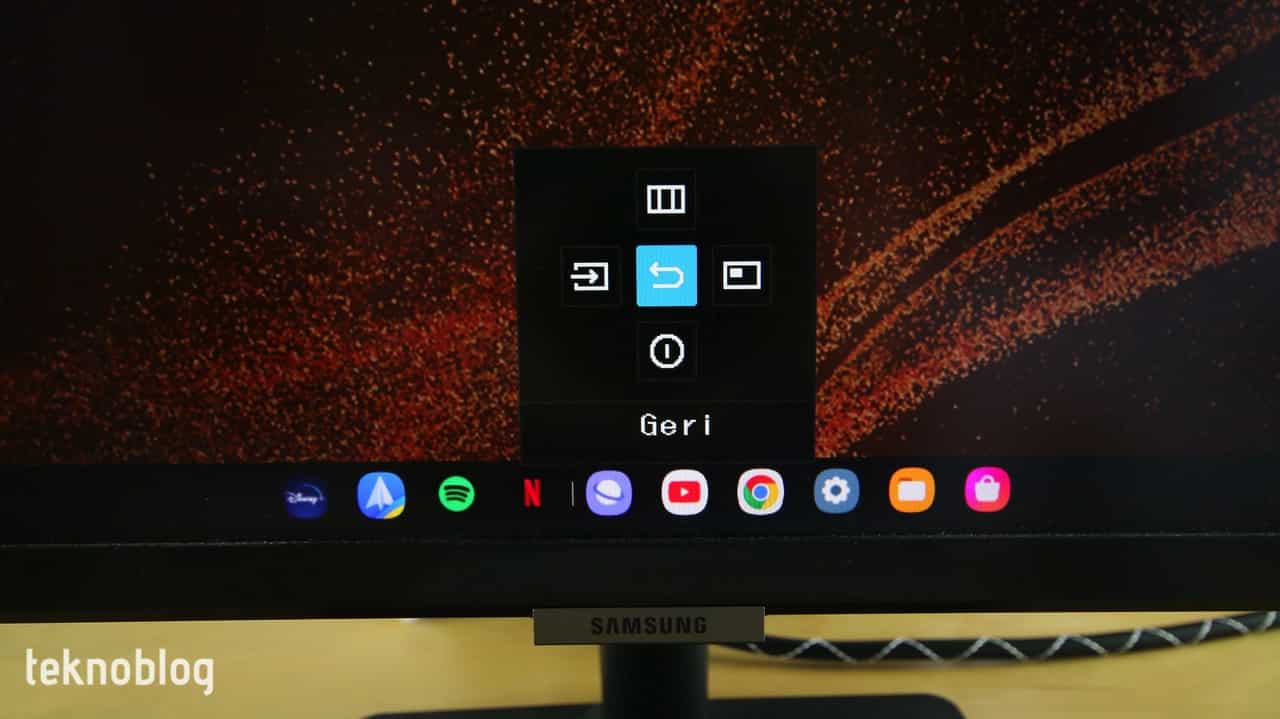 Samsung S27A700’ün kolay anlaşılır ve kullanılabilir bir kullanıcı menüsü var. Monitörün hemen alt kenarındaki Samsung logosunun altında fiziksel kontrol ve gezinti tuşları var. Ortada seçim tuşu varken bunun etrafına yön tuşları yerleştirilmiş. Ortadaki seçim tuşuna bastığınızda menü açılıyor ve yön tuşlarıyla istediğiniz ayara geçiş yapabiliyorsunuz. Monitörü kapatmak için bu menüyü kullanabileceğiniz gibi, giriş kaynağını değiştirmek veya Resim içinde Resim moduna geçmek için de bu menü işinize yarayacaktır.