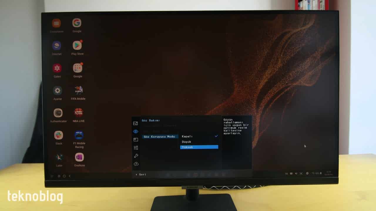 Samsung bu monitörde göz sağlığını da düşünmeden geçmiyor. Kullanıcı menüsü içinde Göz Bakımı şeklinde özel bir bölüm var. Buradaki birkaç ayar arasında Göz Koruyucu Modu da var. Bunun Düşük ve Yüksek olmak üzere iki ayarı var. Düşük ayarda ekran parlaklığı hafif azaltılıyor ve mavi ışık hafif kısılıyor. Yüksek ayar ise hem ekran parlaklığını hem de mavi renk seviyesini daha da düşürerek daha sıcak bir görüntü elde etmeyi sağlıyor. Özellikle geceleri, bir de karanlıkta çalışırken bu mod epey kullanışlı oluyor.