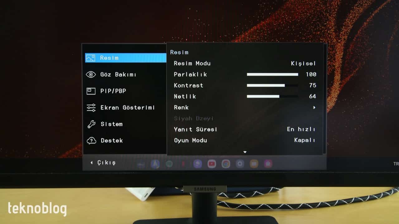 Resim Ayarları içinde Kişisel, Standart, Sinema, Dinamik Kontrast ve Yüksek Parlaklık olmak üzere beş farklı profil var. Kişisel modda parlaklık, kontrast, netlik ve renk ayarlarını elle yapılandırabilirsiniz. Standart renk seviyelerini ortalamalara getirirken parlaklığı, kontrastı ve netliği optimum değerlere indiriyor. Bu ayarda parlaklık biraz düşük kalıyor. Sinema moduna kontrast artırılıyor, beyaz seviyesi hafif sıcak tarafa doğru kayıyor. Özellikle Word, Excel gibi beyaz arka planlı ortamlarda çalışırken bu mod kullanışlı olmuyor. Dinamik Kontrast, adından da anlaşılacağı üzere, başta kontrast olmak üzere diğer ayarları ortama göre yapılandırıyor. Bu modda renkler daha ayırt edici, yazılar daha okunaklı hâle gelse de, parlaklık belli durumlarda çok düşük kalıyor. Yüksek Parlaklık modunda ise parlaklık en yüksek seviyeye çıkıyor. Diğer görüntü ayarlarını elle düzenleyebilirsiniz.