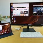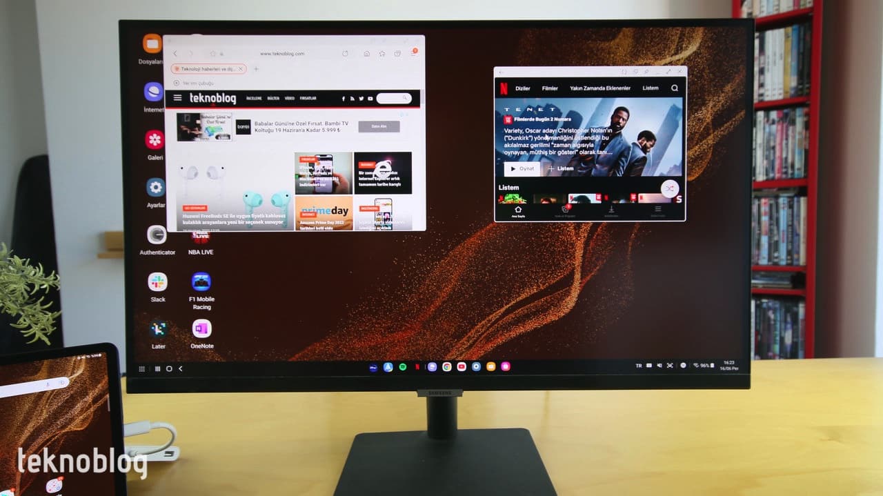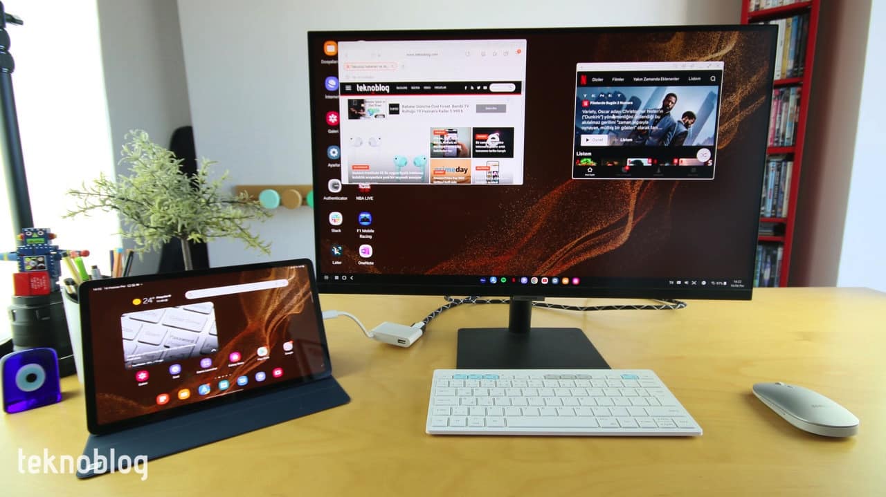 Yukarıda belirttiğim gibi, Samsung S27A700’ü genel olarak MacBook Pro dizüstü bilgisayarla kullansam da, bu yazıyı Samsung Galaxy Tab S8‘de, ona bağlı bir Samsung Bluetooth klavye aracılığıyla yazıyorum. Yukarıdaki fotoğrafta gördüğünüz gibi, Samsung’un tableti ve diğer Samsung aksesuarlarıyla küçük bir masaüstü bilgisayar ortamı yarattım. Samsung’un DeX aracı, akıllı telefonları ve tabletleriyle masaüstü bilgisayar deneyimi elde etmeyi sağlıyor. Samsung S27A700 de bu kullanım senaryosu için fazlasıyla isabetli bir ürün oluyor.