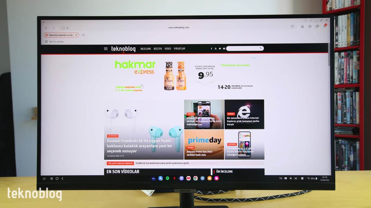 Samsung S27A700, 16:9 görüntü oranına sahip. Eğer küçük bir ekranın varlığı söz konusu olsaydı, bu görüntüleme oranını çok ideal bulmazdım. Ancak 27 inçlik geniş ekranı genellikle iki uygulamayla birlikte kullandım. Ekranın sol kenarında ince ve uzun pencerede Twitter’ı, geride kalan alanda ise ana çalışma alanım olan Chrome internet tarayıcısını kullandım. Bunun dışında Premiere Pro ile video düzenleme işleri yaparken panelleri ekranda, rahatça göreceğim ve çalışabileceğim biçimde yerleştirebildim. Photoshop’da Teknoblog için haber görselleri oluştururken de tam ekranda çalışmak yeterli bir tuval alanı sunuyordu.