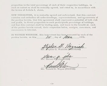 Geçtiğimiz ayın sonlarında Apple’ın kuruluş dokümanlarının açık arttırmayla satılacağı haberi internete yansımıştı. 1976 yılına ait olan kağıtların üzerinde Steve Jobs, Steve Wozniak ve Ronald Wayne’in imzaları yer alıyordu. Açık arttırma haberleri ilk çıktığında bu kuruluş dokümanlarının 150 bin ABD doları civarında bir fiyattan satılacağı düşünülüyordu.
