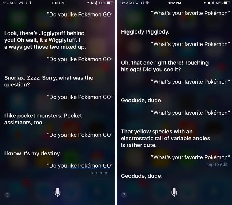 Örneğin, Pokemon Go’yu sevip sevmediği sorulduğunda Siri, “Cep canavarlarını ve cep asistanlarını severim.” şeklinde bir yanıt verebiliyor. “En sevdiğin Pokemon” hangisi sorusuna ise “Snorlax. Zzz. Özür dilerim, soru neydi?” şeklinde karşılıklar sunabiliyor. Bu noktada Snorlax’ın uykuculuğuyla meşhur bir Pokemon olduğunu hatırlatmakta fayda var.