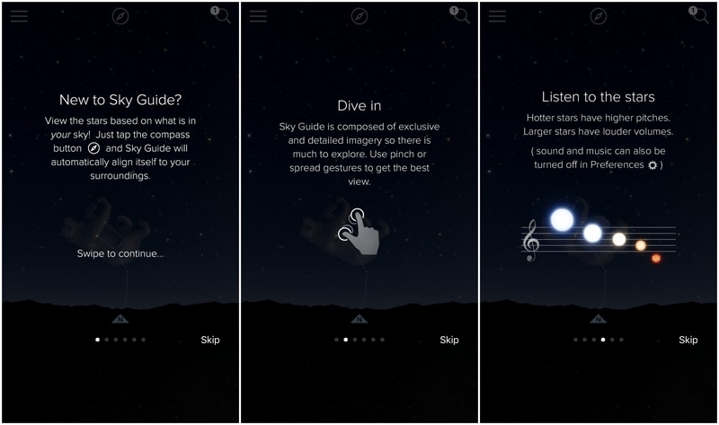 Uygulamayı iPhone, iPod touch veya iPad’inize indirdikten sonra, öncelikle uygulamayı nasıl kullanabileceğinizin bilgileri birkaç ekran görüntüsü ile paylaşılmış. Eğer bu bilgilere bakmak istemezseniz “Skip” tuşuna basarak bu aşamayı geçip direkt olarak uygulamayı kullanmaya başlayabilirsiniz. Uygulamayı açar açmaz ekrana gökyüzünü, yıldızları ve yıldız haritalarını gösteren bir resim geliyor. Bu resim üzerinde parmağınızı sürükleyerek farklı yıldız ve yıldız haritalarını inceleyebilirsiniz. Telefonunuzu gökyüzüne kaldırdığınızda ise, otomatik olarak devreye giren pusula modu ile bulunduğunuz konuma göre gökyüzünde görülen veya görülmeyen yıldızları, uyduları ve yıldız haritalarını görebilirsiniz.