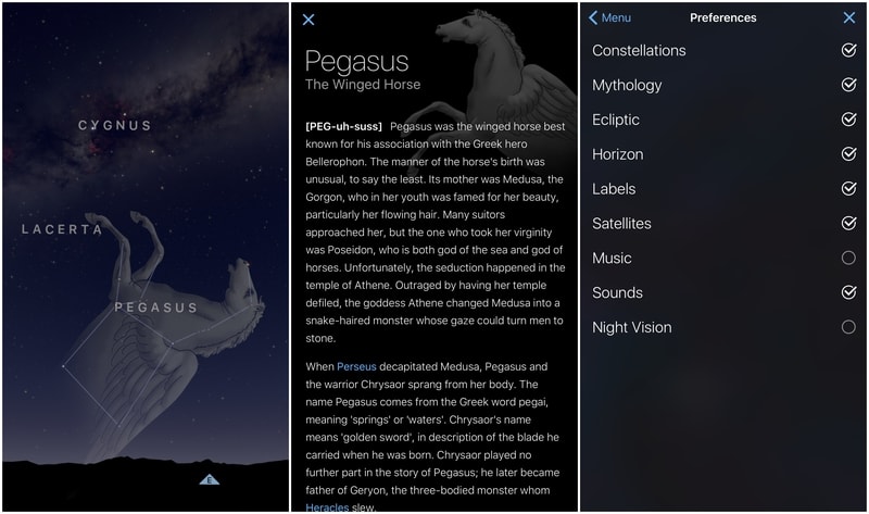Herhangi bir gezegen veya yıldızın etrafındaki detayları incelemek istiyorsanız, iki parmağınız ile merak ettiğiniz bölgeyi büyütmeniz yeterli. Gökyüzü parlaklığını da iki parmağınızı aynı anda ekrana dokundurarak değiştirebiliyorsunuz. Uygulamada herhangi bir yıldızın, gezegenin veya takımyıldızlarının üzerine dokunduğunuzda gök cisminin parlaklığına göre belirlenen bir müzik notası çalınıyor. Bir yıldız ne kadar büyükse, ses de o kadar yüksek oluyor. Uygulama arkasında çalan müzik veya bildirim tonlarını kapatmak isterseniz sol üst menüde yer alan “Preferences” bölümünde “Music” ve “Sounds” karşısında yer alan seçim işaretini kaldırmanız yeterli. Ekranda yıldız, takımyıldızı, gezegen veya uydu ne olursa olsun, gök cisminin üstüne tıklattığınızda, yanında bir bilgi düğmesi beliriyor (“i”). Bu düğmeye dokunduğunuzda gök cismi hakkında tüm detaylı bilgilere kolayca erişebiliyorsunuz.