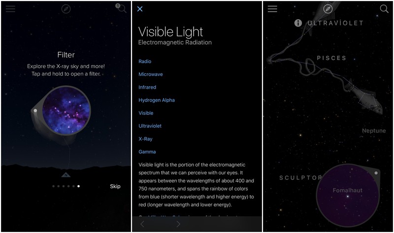 Uygulamada sağlanan farklı filtreler ile gökyüzüne farklı modlarda bakmanız mümkün. Bunun için yapmanız gereken, istediğiniz yıldız veya gezegenin üzerine uzun süreli tıklatmak. Tıklatma sonrası ekranda büyüteç gibi bir şekil beliriyor. Bu şekli döndürerek microwave, infrared, ultraviolet ve benzeri farklı filtre modlarına geçebiliyorsunuz.