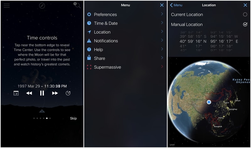 Zaman kontrolü ile istediğiniz yıldız veya gezegenin en iyi göründüğü zamanı belirleyebilir, ayrıca geçmiş tarihlerden en iyi göründüğü bir güne dönebilirsiniz. Bunun için sol üstteki menüden “Time&Date” bölümüne tıklamanız yeterli. Bu bölümde mevcut zaman için “Current Time” seçeneğini tıklayabilir veya “Select Time” seçeneği ile geçmiş bir tarihe gidebilirsiniz. Yine sol üst menüde yer alan “Locations” bölümünde bulunduğunuz konumu seçebilir veya merak ettiğiniz farklı lokasyonu “Manual Locations” bölümüne tıklayarak değiştirebilirsiniz.