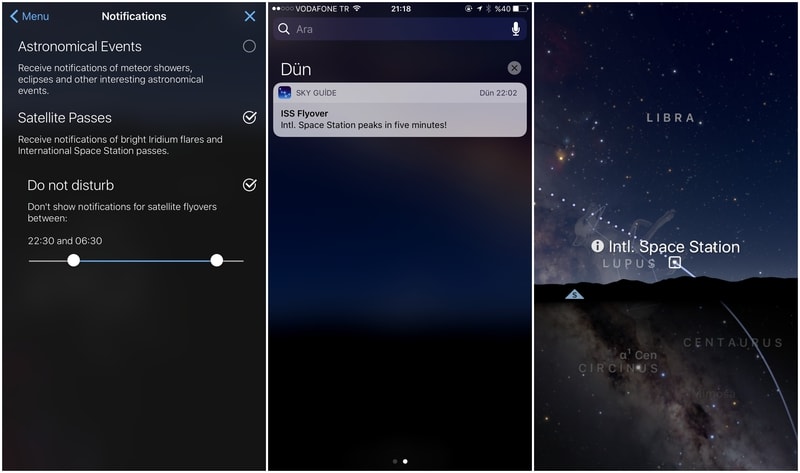 Meteor yağmurları, tutulmalar gibi gökbilimi olaylarından daha önce haberinizin olmasını istiyorsanız sol üst menüde yer alan “Notifications” bölümüne girerek bu bildirimleri açabilirsiniz. Ayrıca bildirimlerin uykunuzu bölmesini istemiyorsanız yine “Notifications” altında yer alan “Do not disturb” bölümünde rahatsız edilmek istemediğiniz saatleri girebilirsiniz. Uygulamayı kullanım sırasında ben Uluslararası Uzay İstasyonunun geçiş bildirimini açmıştım. Ve bir akşam uzay istasyonunun 5 dakika içerisinde bulunduğum konumdan geçeceğini bildiren bir bildirim aldım. Hemen gökyüzüne baktığımda gördüğümün uçak mı yoksa uzay istasyonu mu olduğunu anlamaya çalışırken, uygulamayı alıp gökyüzüne tuttuğumda geçen nesnenin gerçekten uzay istasyonu olduğunu anlamak benim için gerçekten heyecan verici bir deneyim oldu.