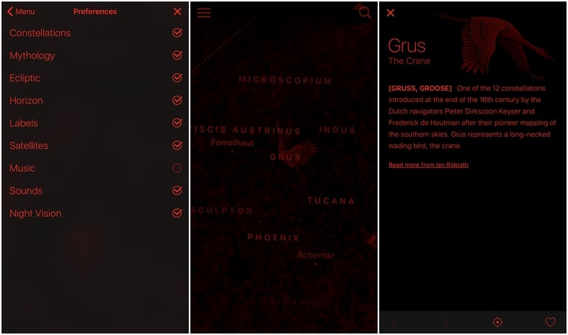 Eğer gökyüzü merakınız fazla ise ve telefona sürekli bakmaktan gözlerinizin yorulacağınız düşünüyorsanız, uygulamada sağlanan gece görüşüne geçebilirsiniz. Sol üst menüde “Preferences” kısmında “Night Vision” seçeneğini tıkladığınızda tüm beyaz yazıların kırmızıya döndüğünü ve ekranda gözlerinizi rahatsız eden parlaklığın kaybolduğunu hemen fark edeceksiniz.