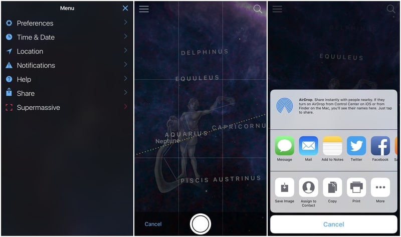 Gökyüzünde sizi etkileyen bir görüntüyü biriyle paylaşmanız da mümkün. “Preferences” bölümünde, “Share” seçeneğine tıkladığınızda ekrana fotoğraf çekmenizi sağlayan bir tuş geliyor. Gökyüzünde istediğiniz noktanın fotoğrafını çekip bunu, mesaj, e-posta, Twitter, Facebook kanallarından biri ile paylaşabilir veya görüntüyü fotoğraf albümünüze kaydedebilirsiniz.