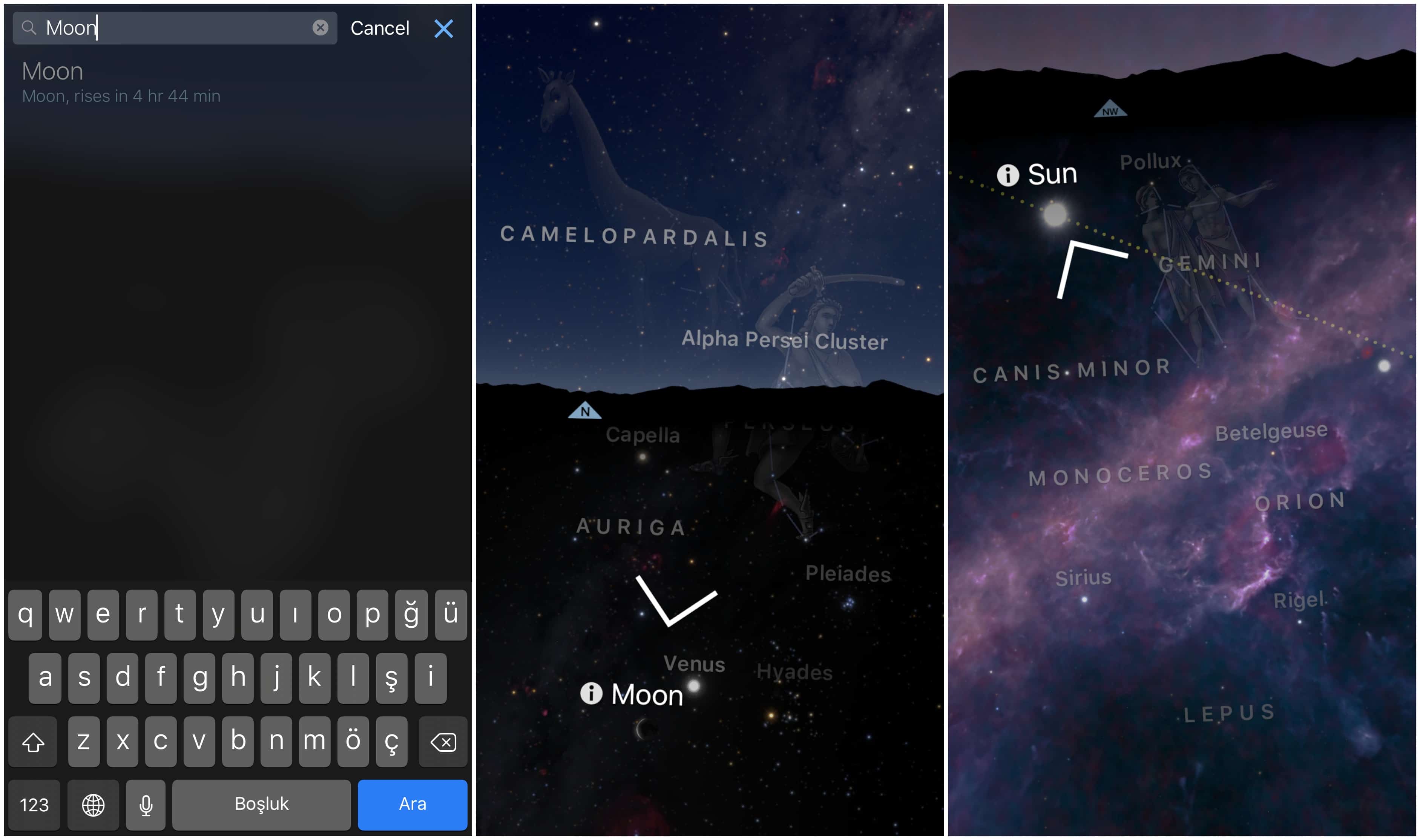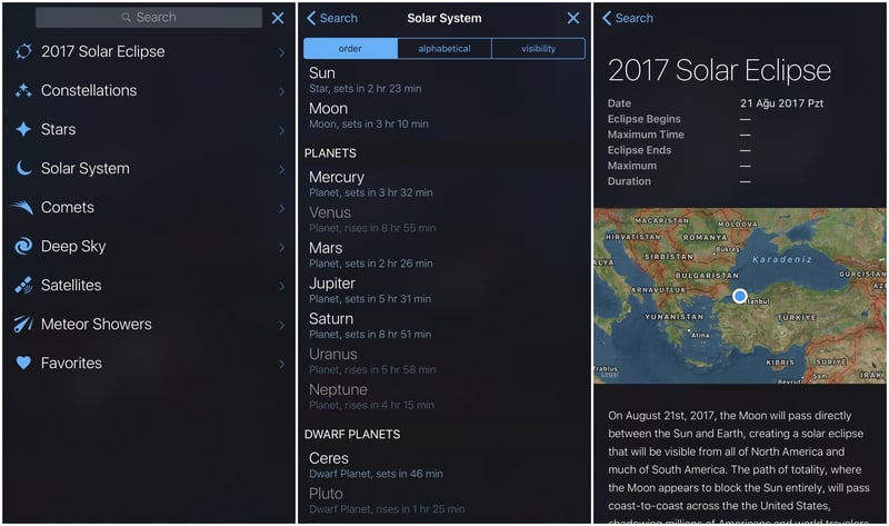 Uygulamanın güzel özelliklerden birisi de arama bölümünün olması. Sağ üst kısımda bulunan arama butonuna tıkladığınızda güneş tutulması, takımyıldızı, yıldız, güneş sistemi, kuyruklu yıldız, derin gökyüzü, uydular ve meteor yağmurları hakkında detaylı bilgilere ulaşabilirsiniz. 2017 yılında güneş tutulmasının hangi tarihte olacağı, nerelerden görülebileceği bilgileri ayrıntılı şekilde “2017 Solar Eclipse” altında verilmiş. Hangi yıldızın veya güneş sistemindeki herhangi bir gezegenin ne zaman görünür olacağı bilgisine de yine bu bölümden ulaşabilirsiniz. Ayrıca gökyüzünde o an göremediğiniz bir yıldızı veya uyduyu aradığınızda, aradığınız gök cisminin yerini dünyanın konumuna göre harita üzerinden görebilirsiniz.