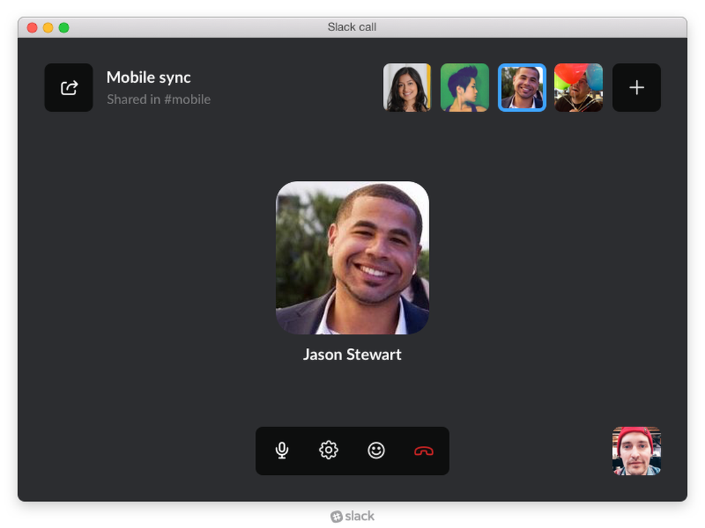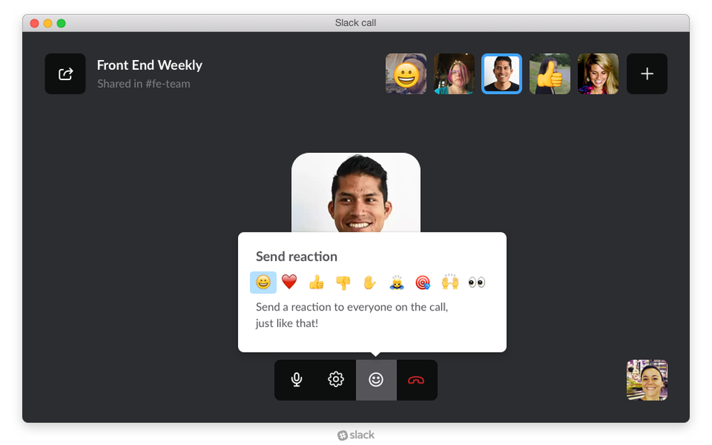 Bundan sonrasında Slack diğer sesli görüşme uygulamaları gibi işliyor, çağrıda bulunan kişilerin ikonlarını gösteriyor ve konuşmakta olan kişiyi ön plana çıkarıyor. Slack’e özel bir eklenti de var, Reaksiyonlar özelliği görünür hâle geliyor, buradan konuşmakta olan kişiye ikonunuz üzerinde görünecek bir emoji ile cevap vermeniz mümkün oluyor.