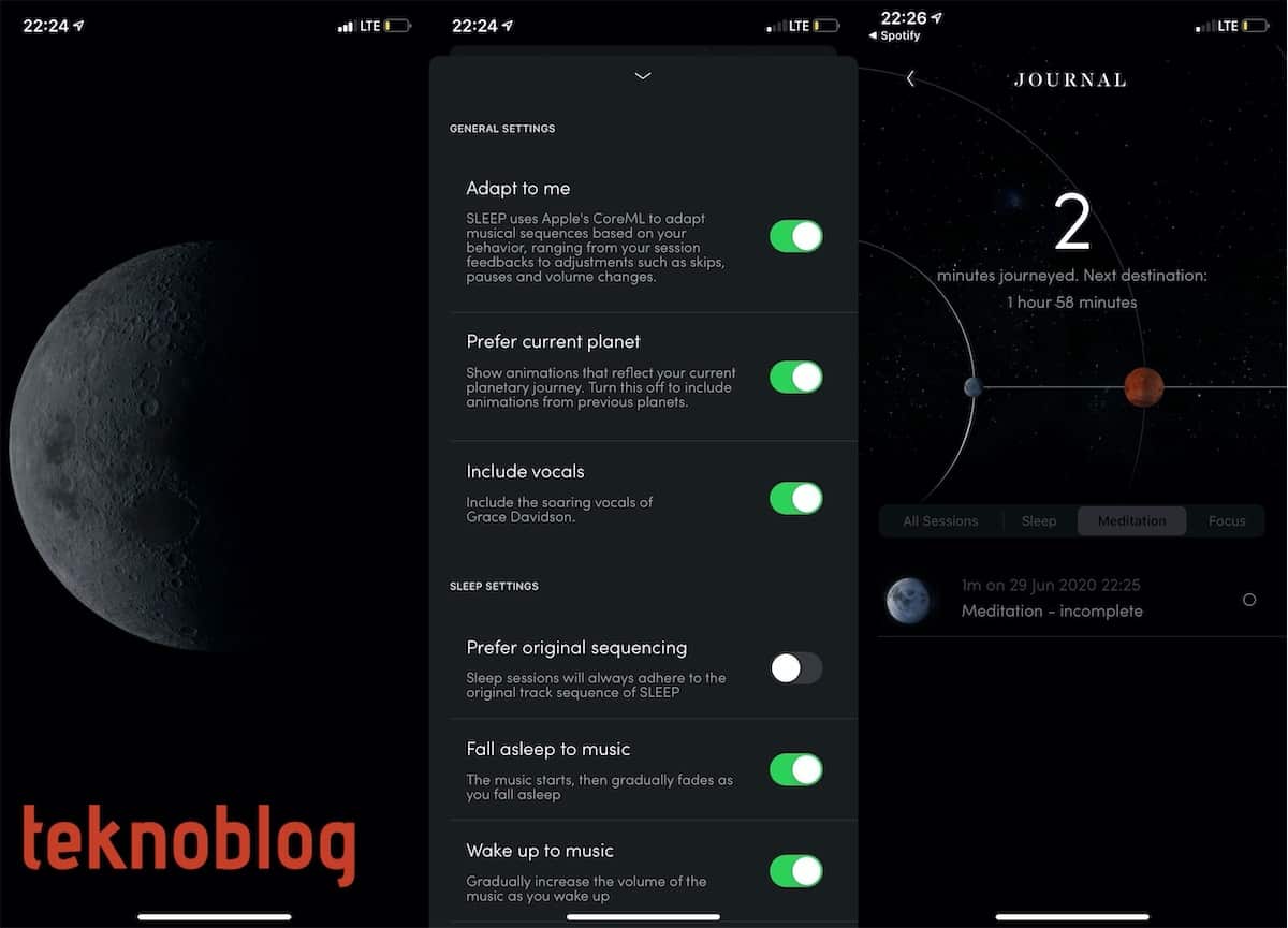 Sleep’in “evrende bir yolculuk” formatında tasarlandığını söylemek mümkün. Kullanıcılar tamamladıkları her bir seansta kendi evrenlerinde yeni bir bölgeyi keşfediyor. Bu yolculuk Max Richter’in müzikleri eşliğinde gerçekleştiriliyor. Uyku seansları için kullanıcılardan alarmın çalacağı bir saat belirlemeleri istenirken, odaklanma ve meditasyon seansları için genel bir süre belirleniyor. Uyanma saati veya belirlenen süre geldiğinde oturum sonlandırılıyor. Ancak belirlenen zaman gelmeden önce de seansların manuel olarak bitirilebileceğini hatırlatmakta fayda var.
